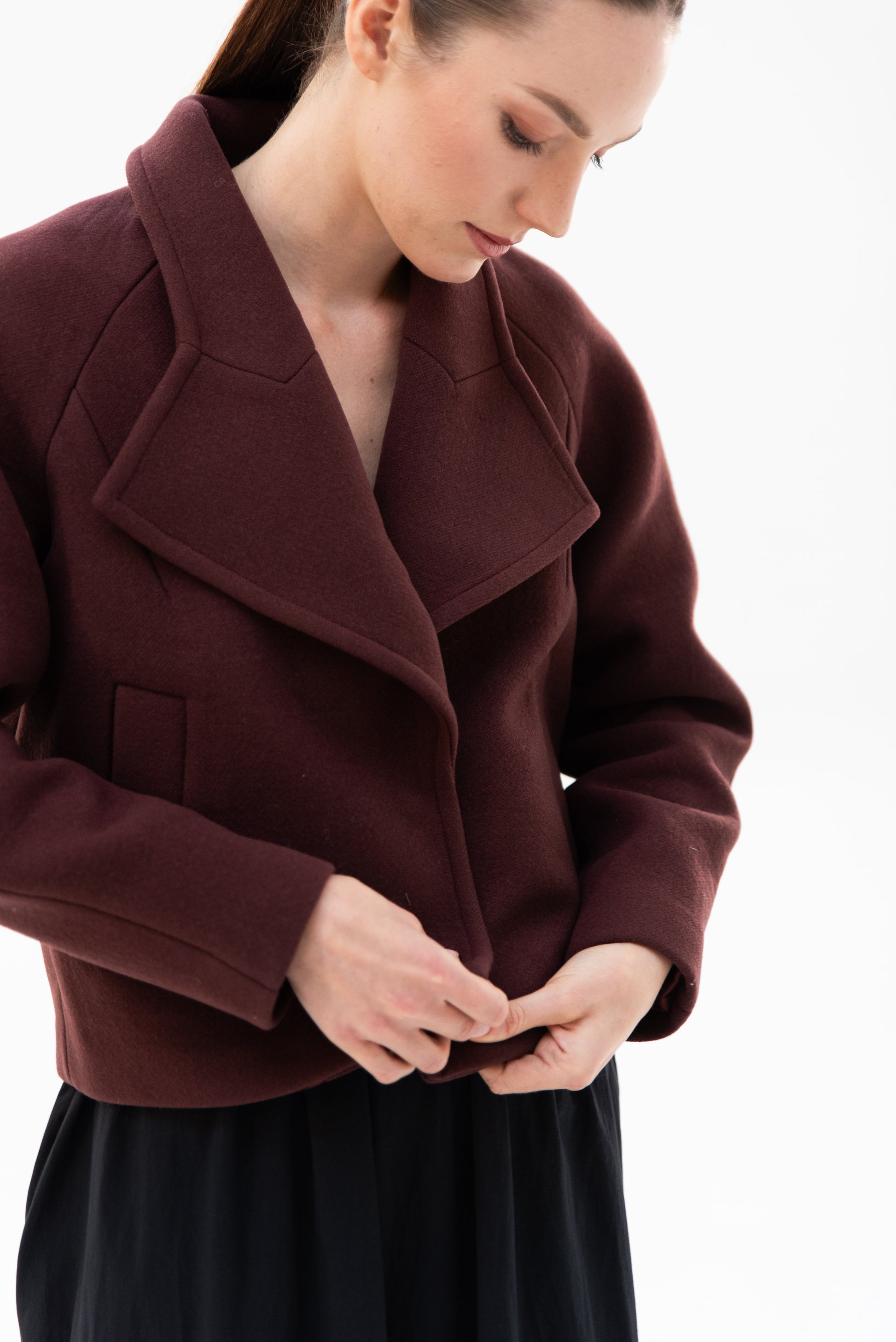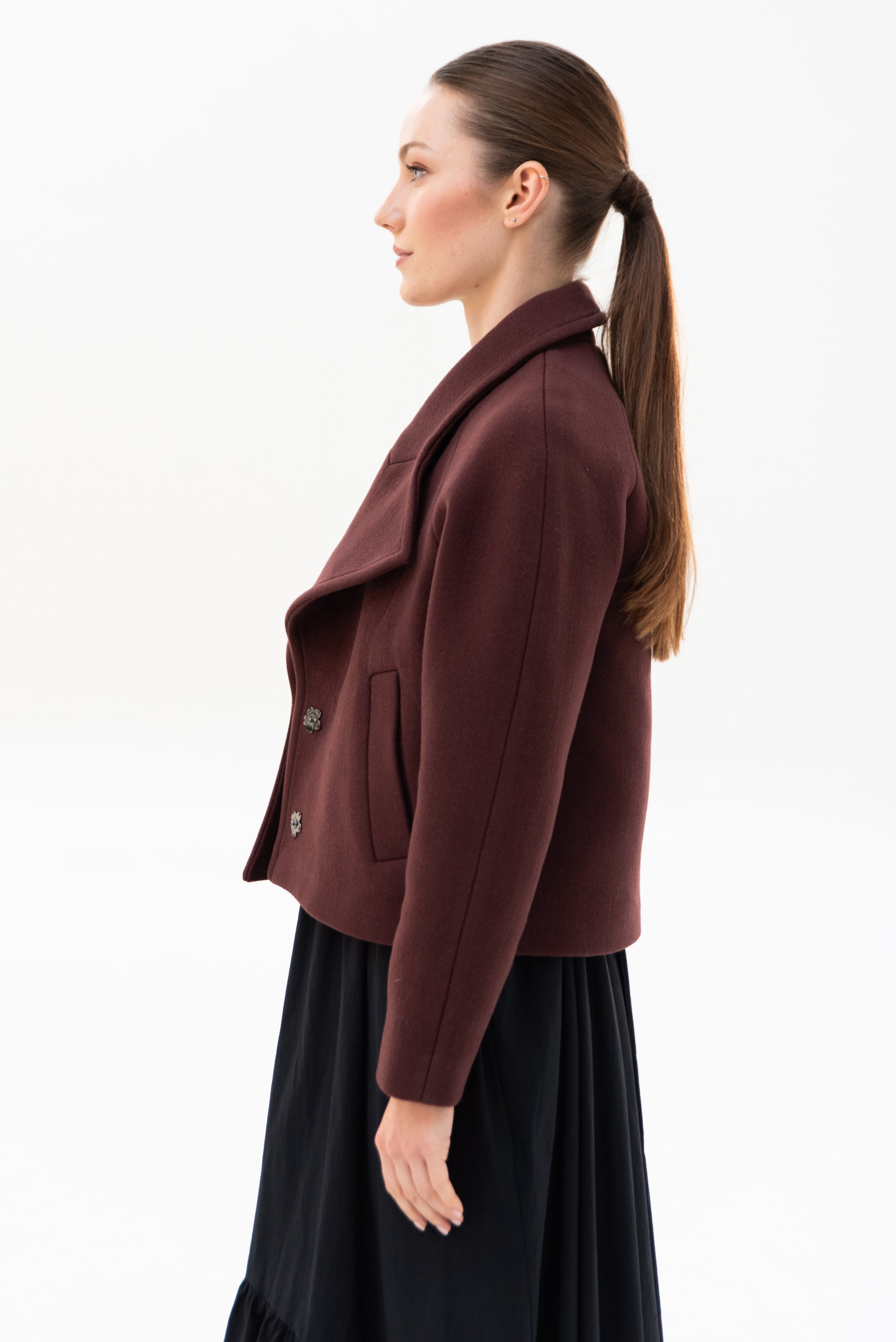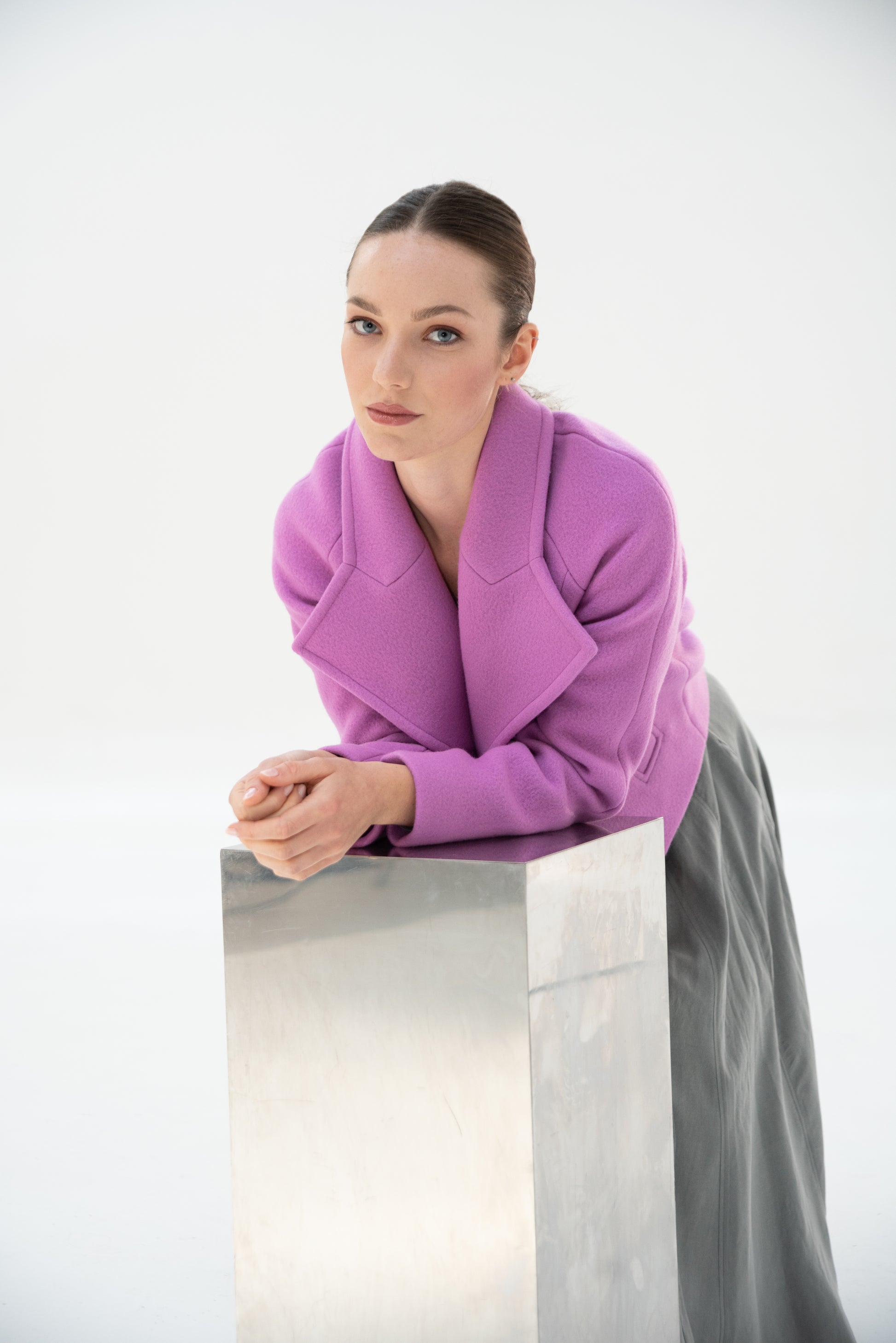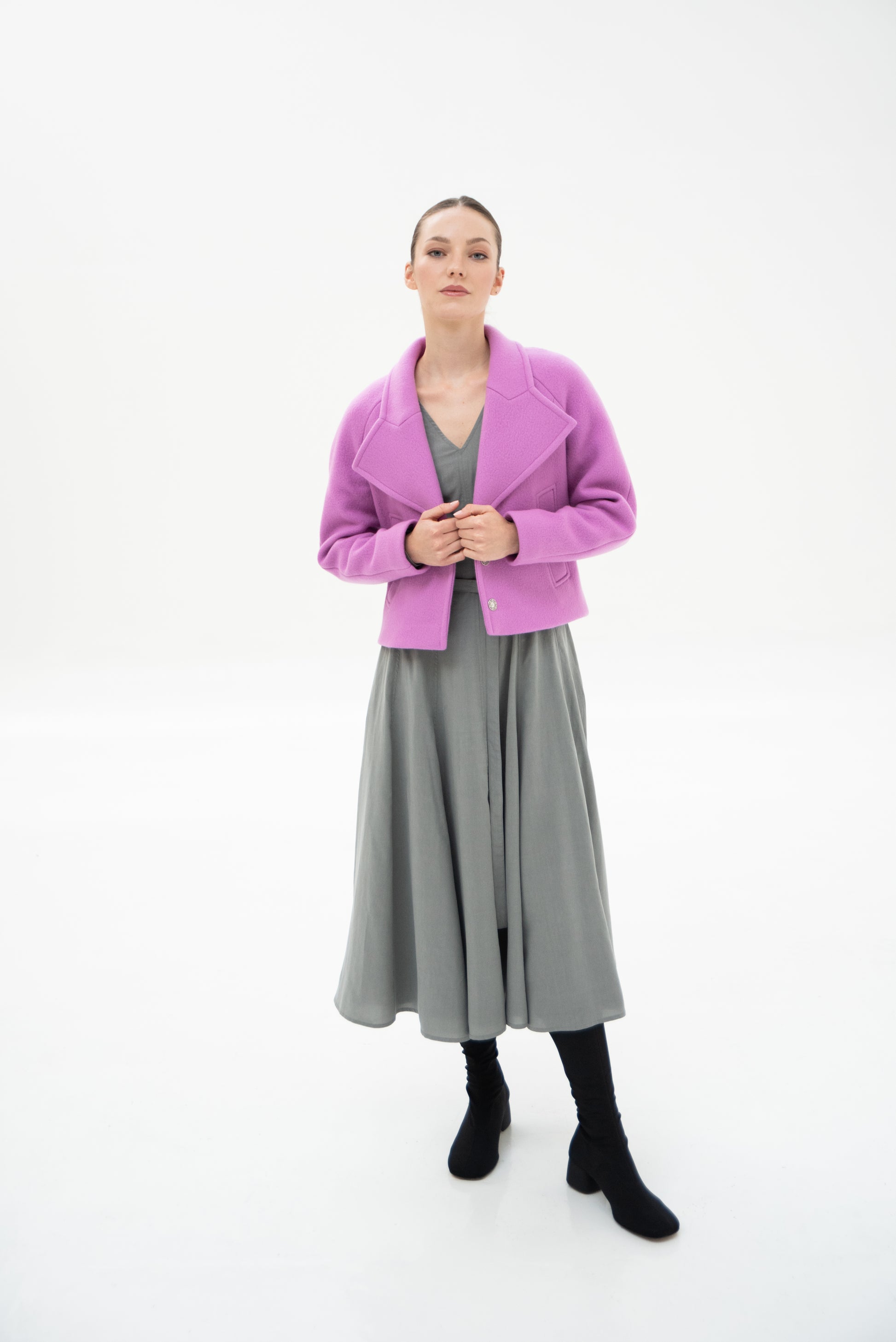 Krátký kabátek ze směsi vlny a kašmíru vám zvedne náladu i v těch nejchmurnějších zimních dnech. Dvě kapsy, výrazný límec a zúžené raglánové rukávy. Kabát je celopodšitý a zapíná se na dva patentky.