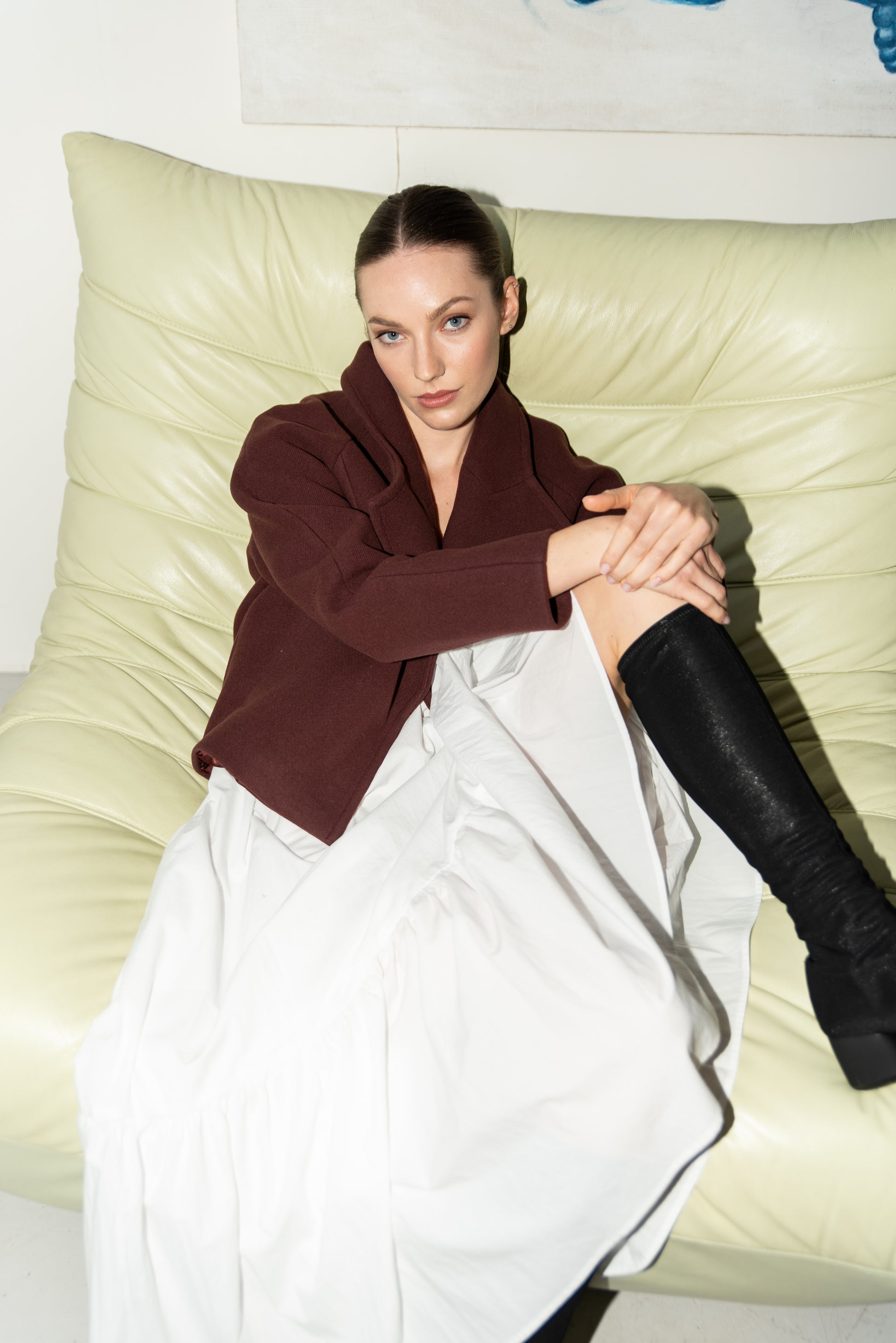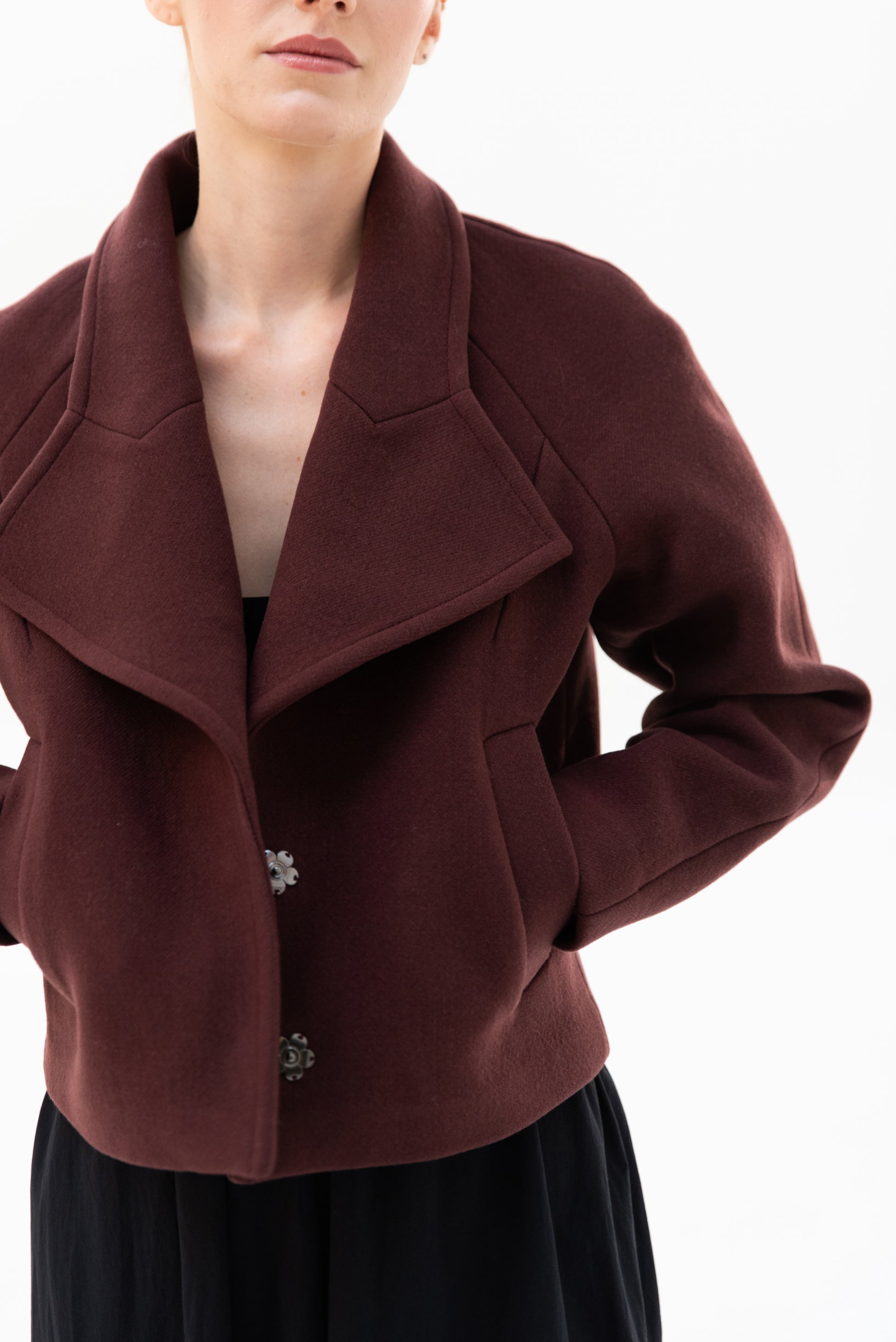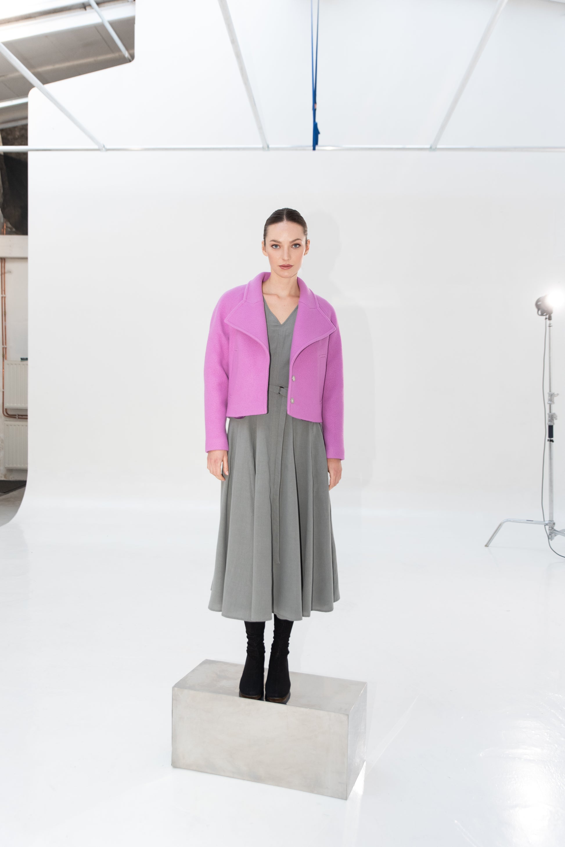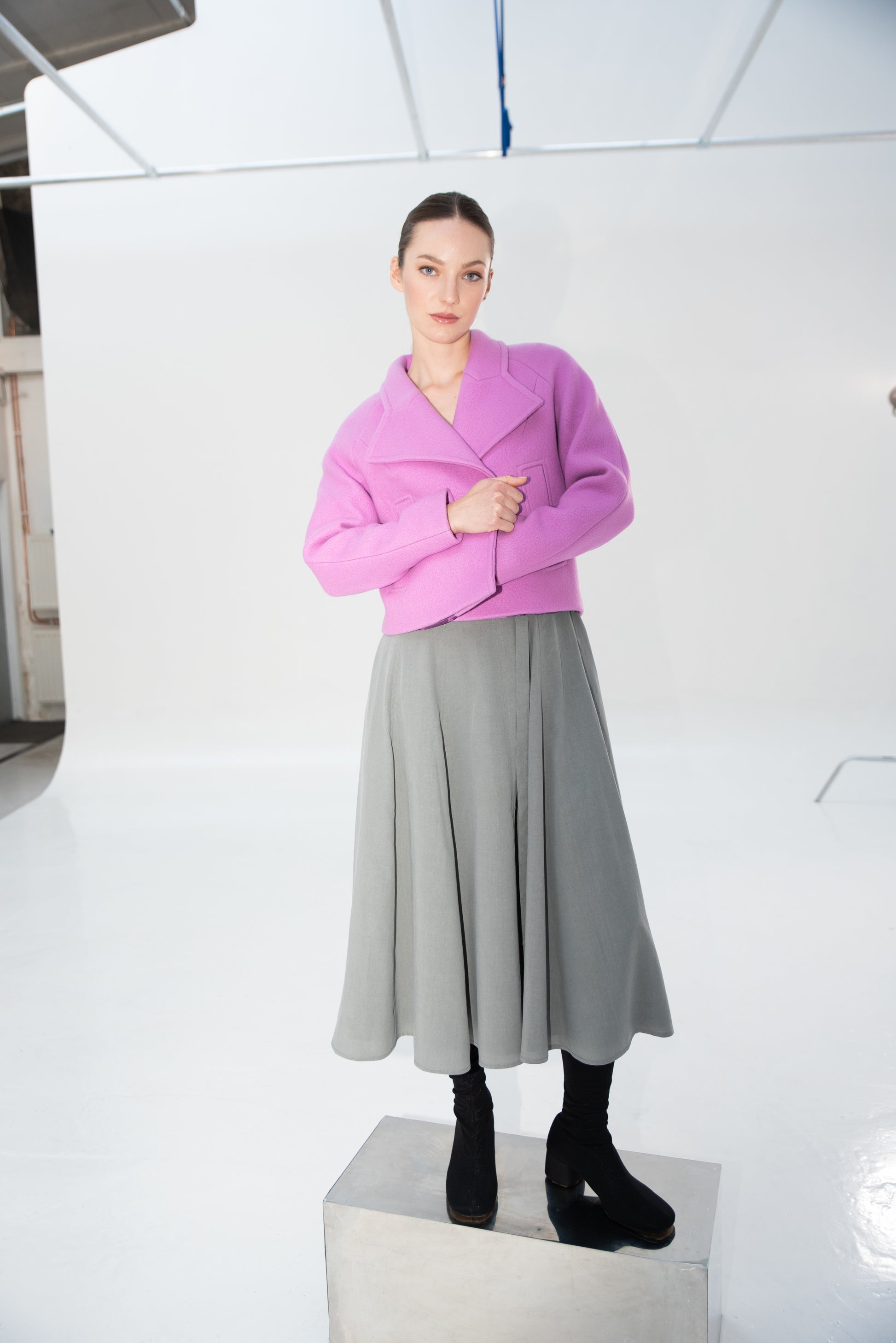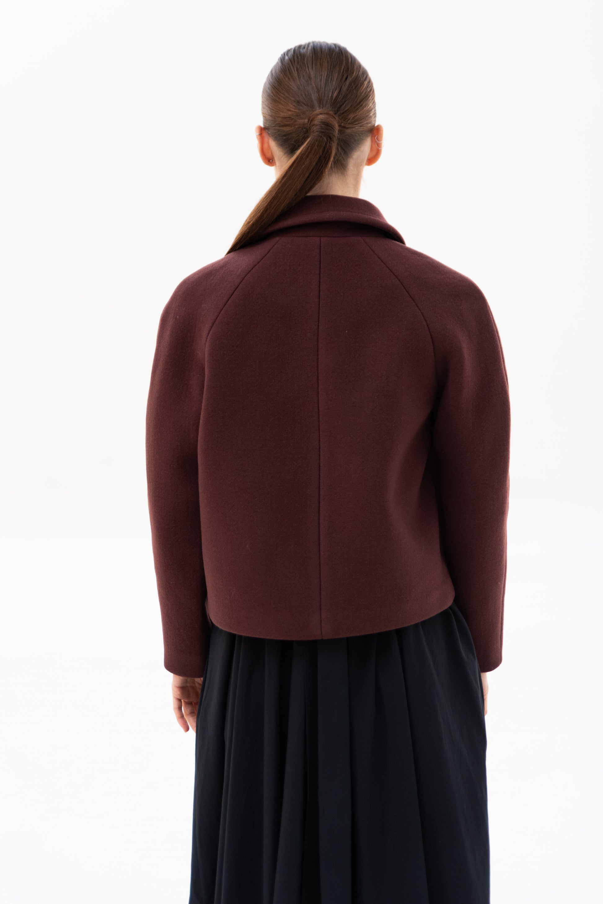 Krátký kabátek ze směsi vlny a kašmíru vám zvedne náladu i v těch nejchmurnějších zimních dnech. Dvě kapsy, výrazný límec a zúžené raglánové rukávy. Kabát je celopodšitý a zapíná se na dva patentky.