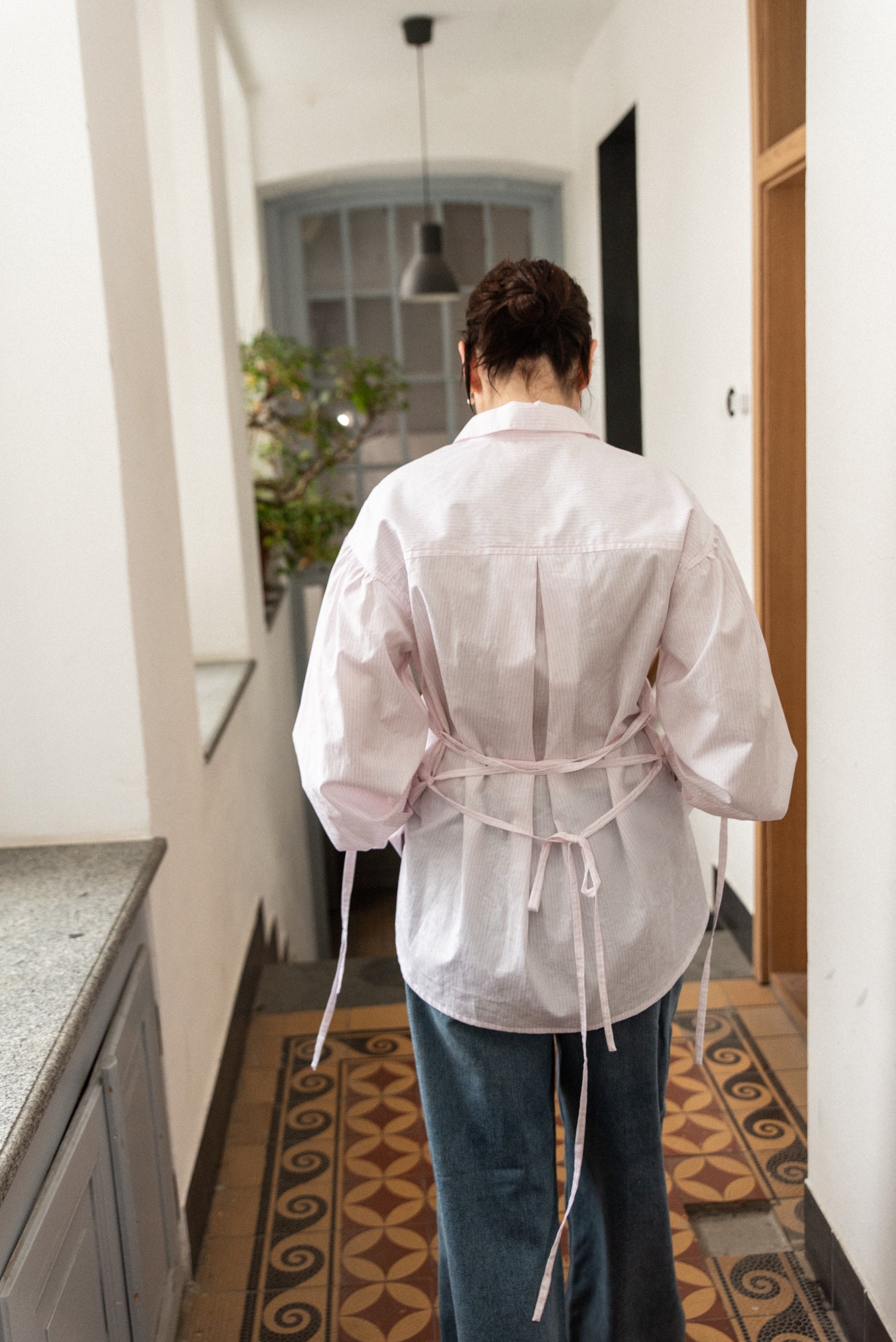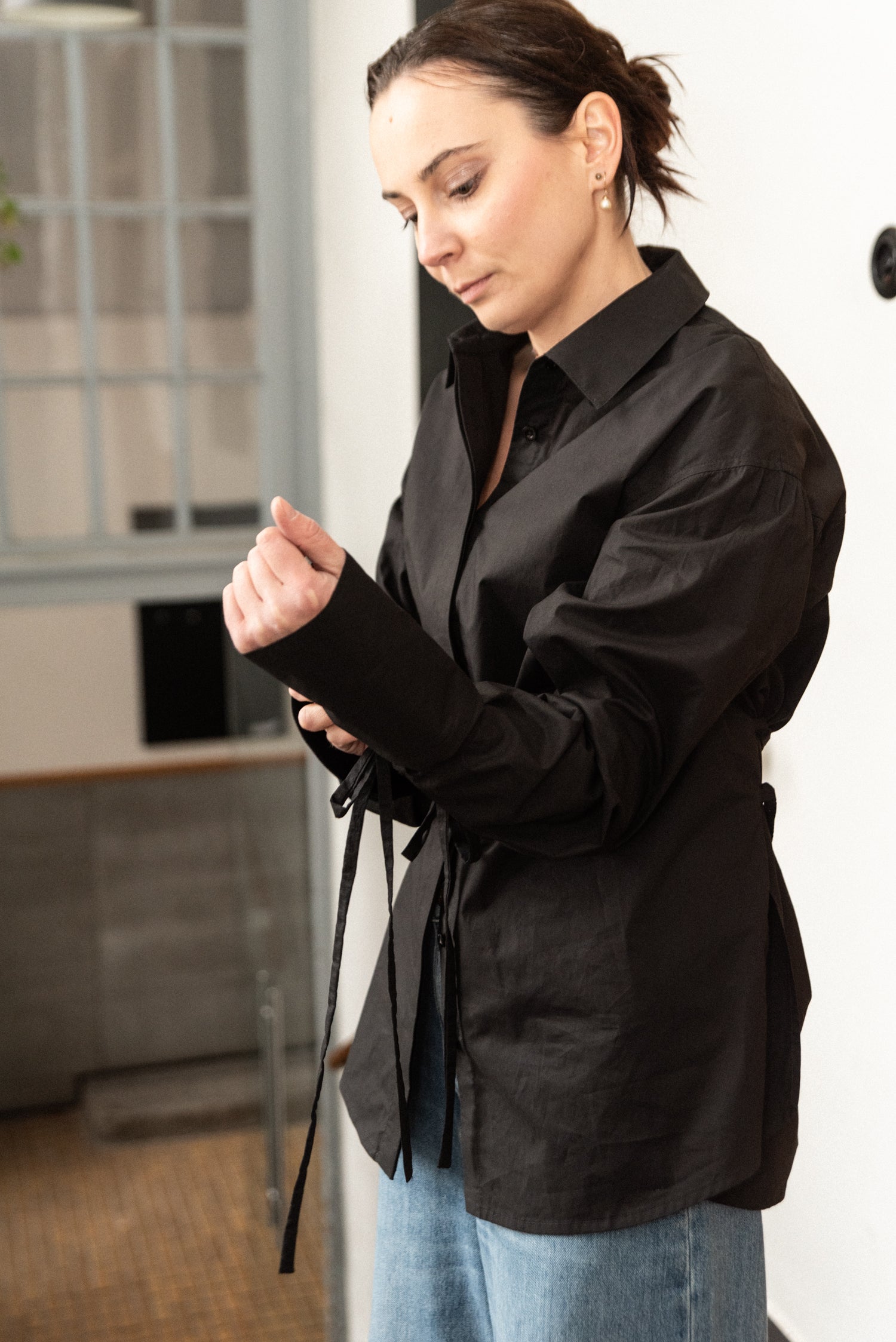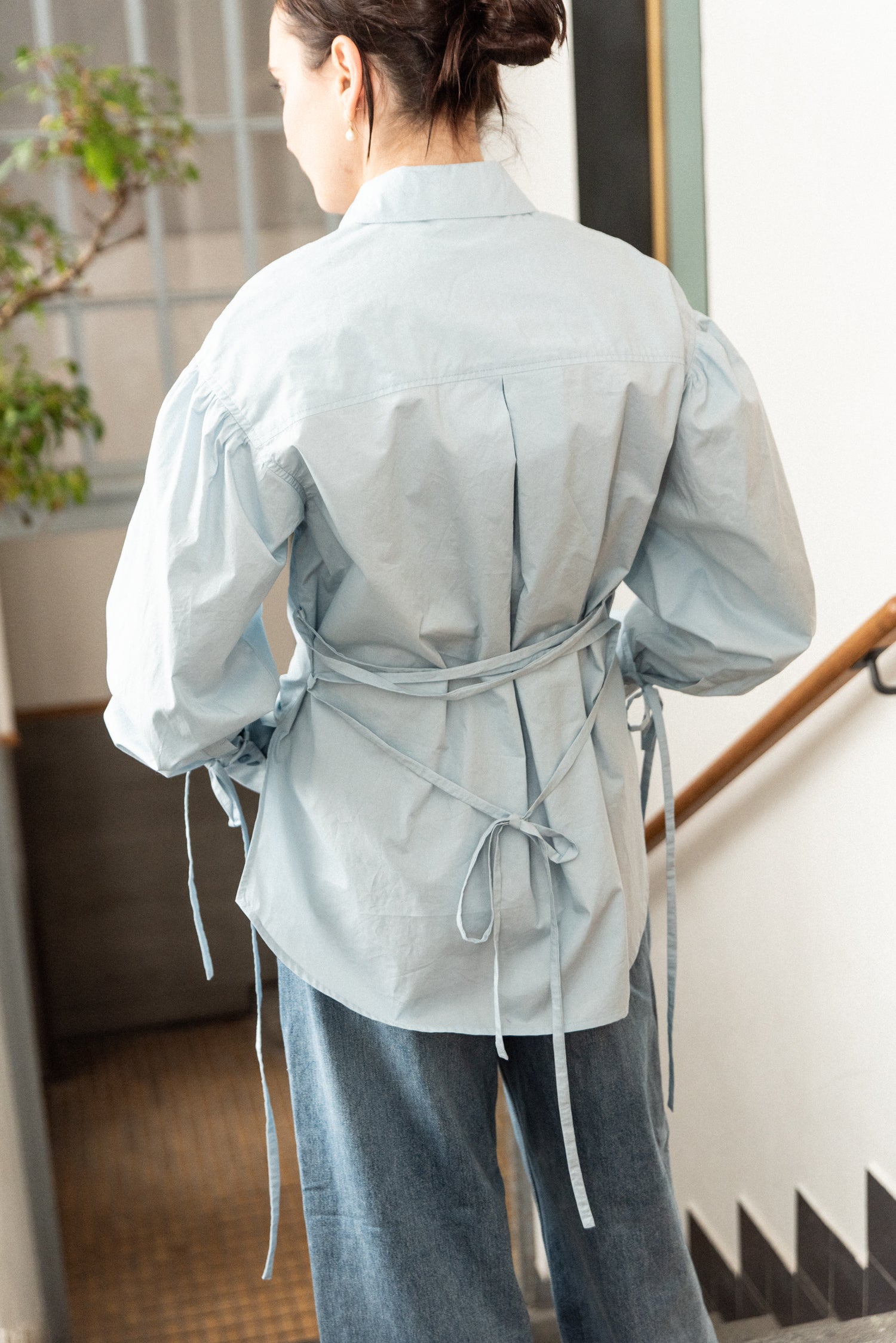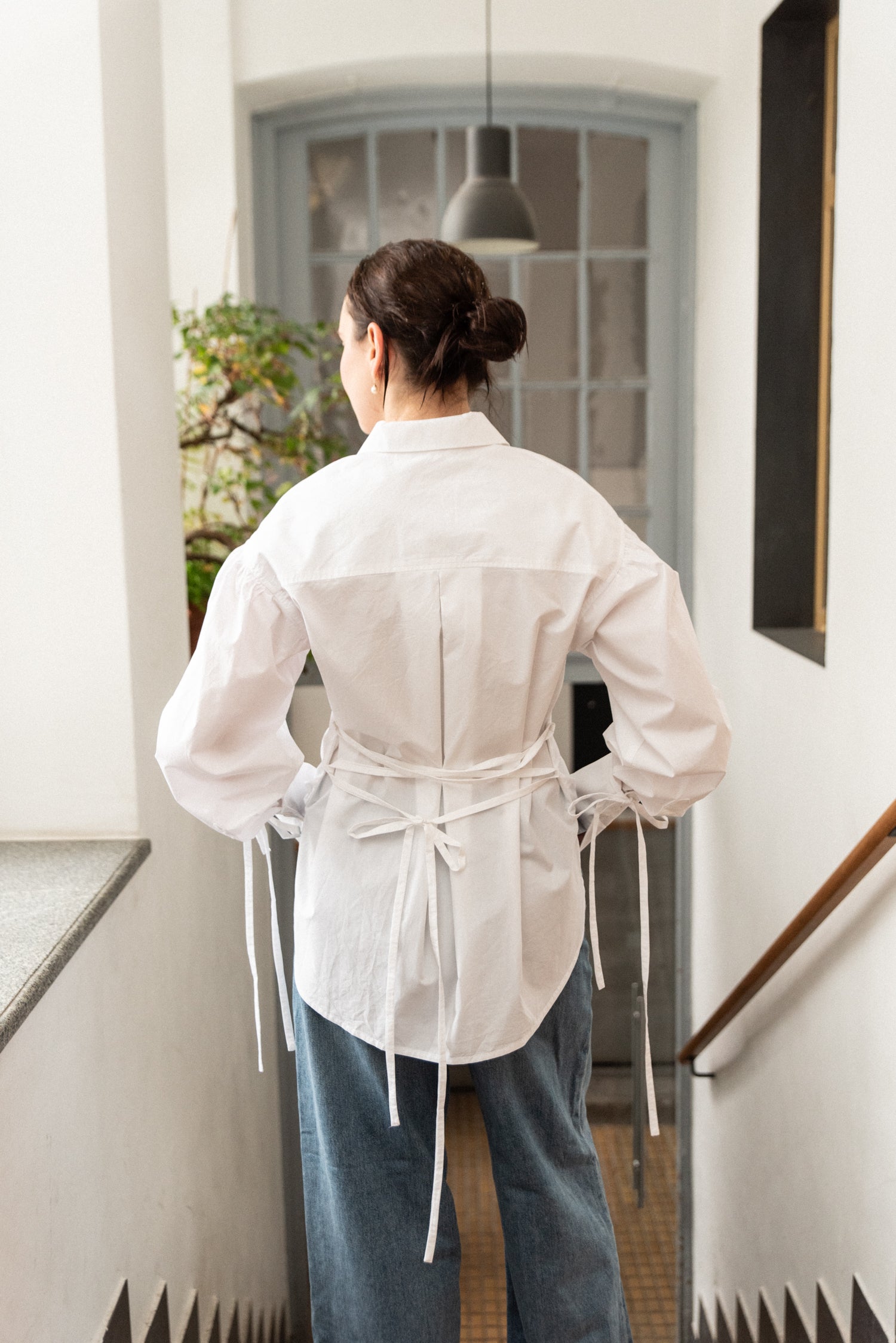Minimalistická oversize košile z jemného bavlněného popelínu. Volný střih se spadlým ramenem pro maximální pohodlí a ležérní vzhled. Dlouhé manžety na knoflíčky, šněrování na zádech pro snadné přizpůsobení postavě.