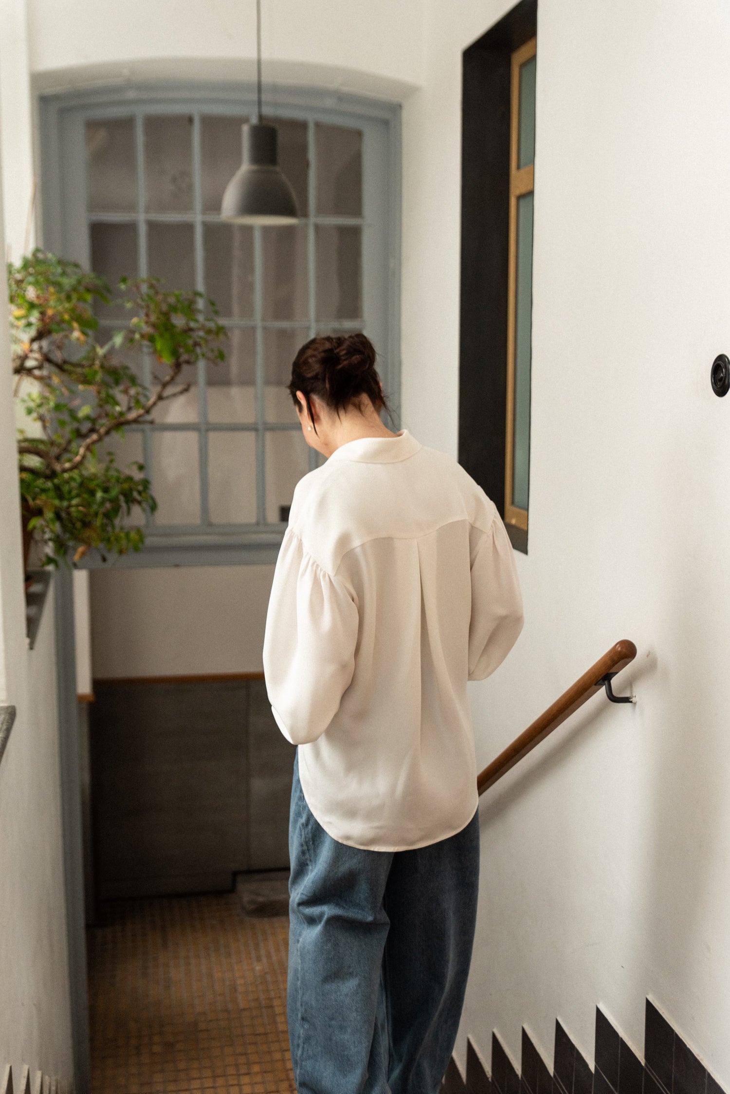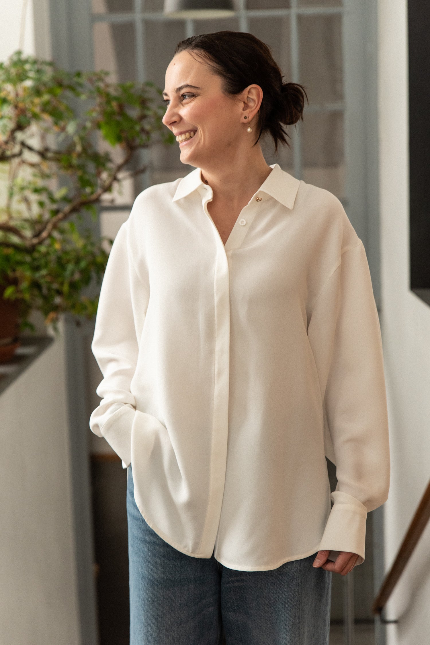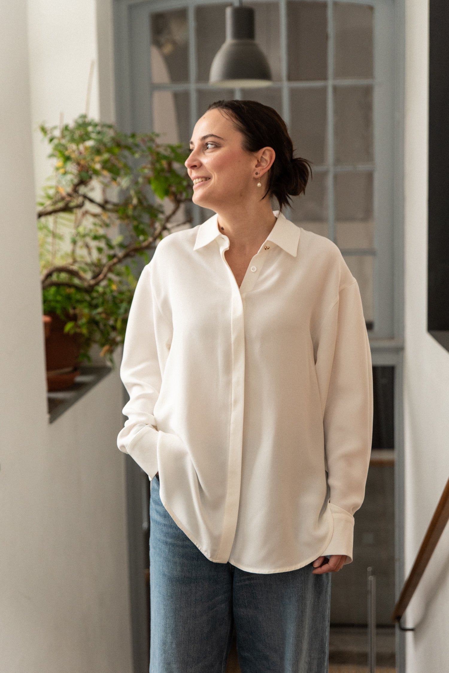 Minimalistická oversize košile z hedvábného krepu vyšší gramáže v barvě off white. Volný střih se spadlým ramenem pro maximální pohodlí a ležérní vzhled. Manžety na ozdobný knoflíček.