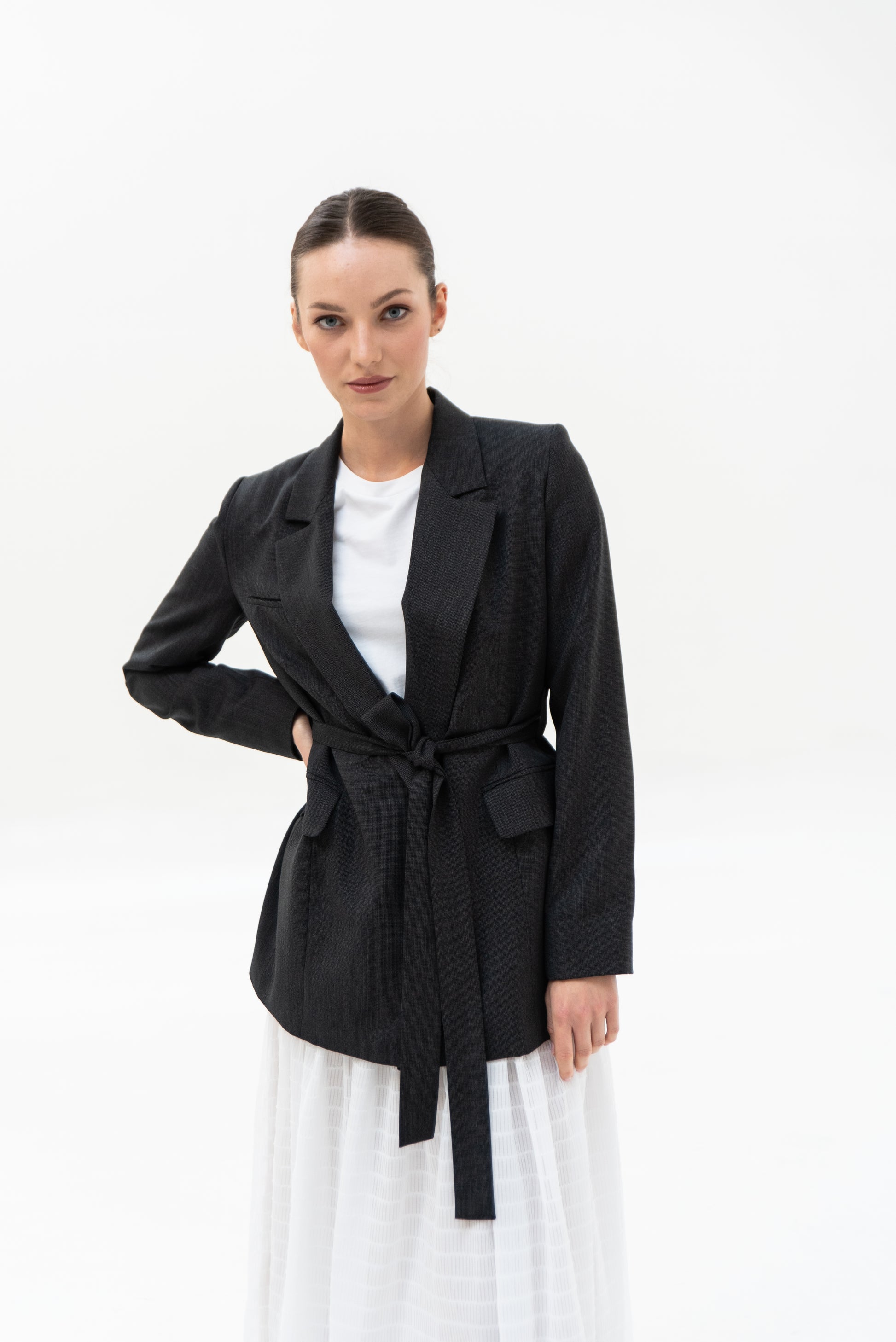 Sako klasického střihu s pánskými prvky. Sako je celopodšité a zapíná se pouze na zavazování, vzadu rozparek.
