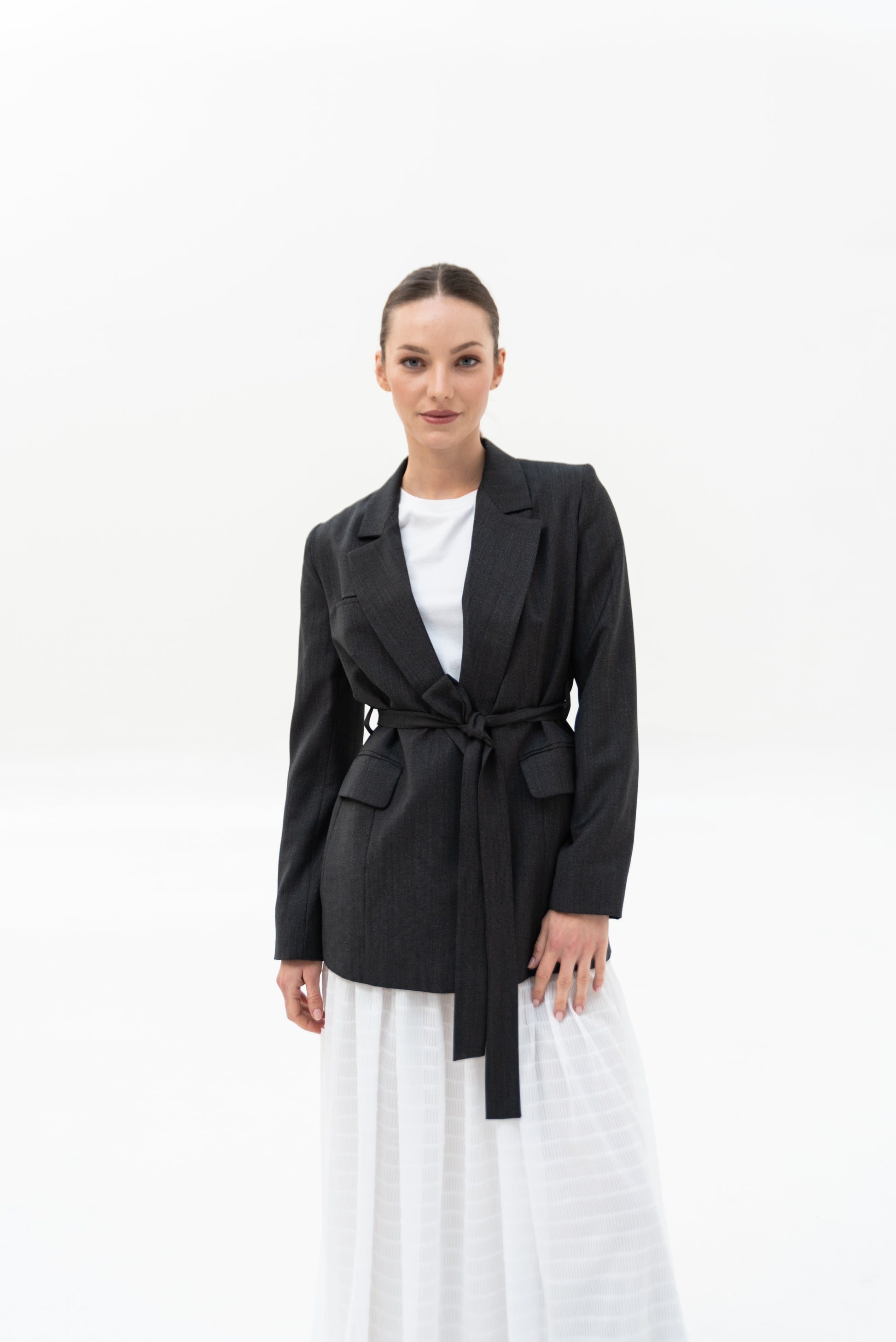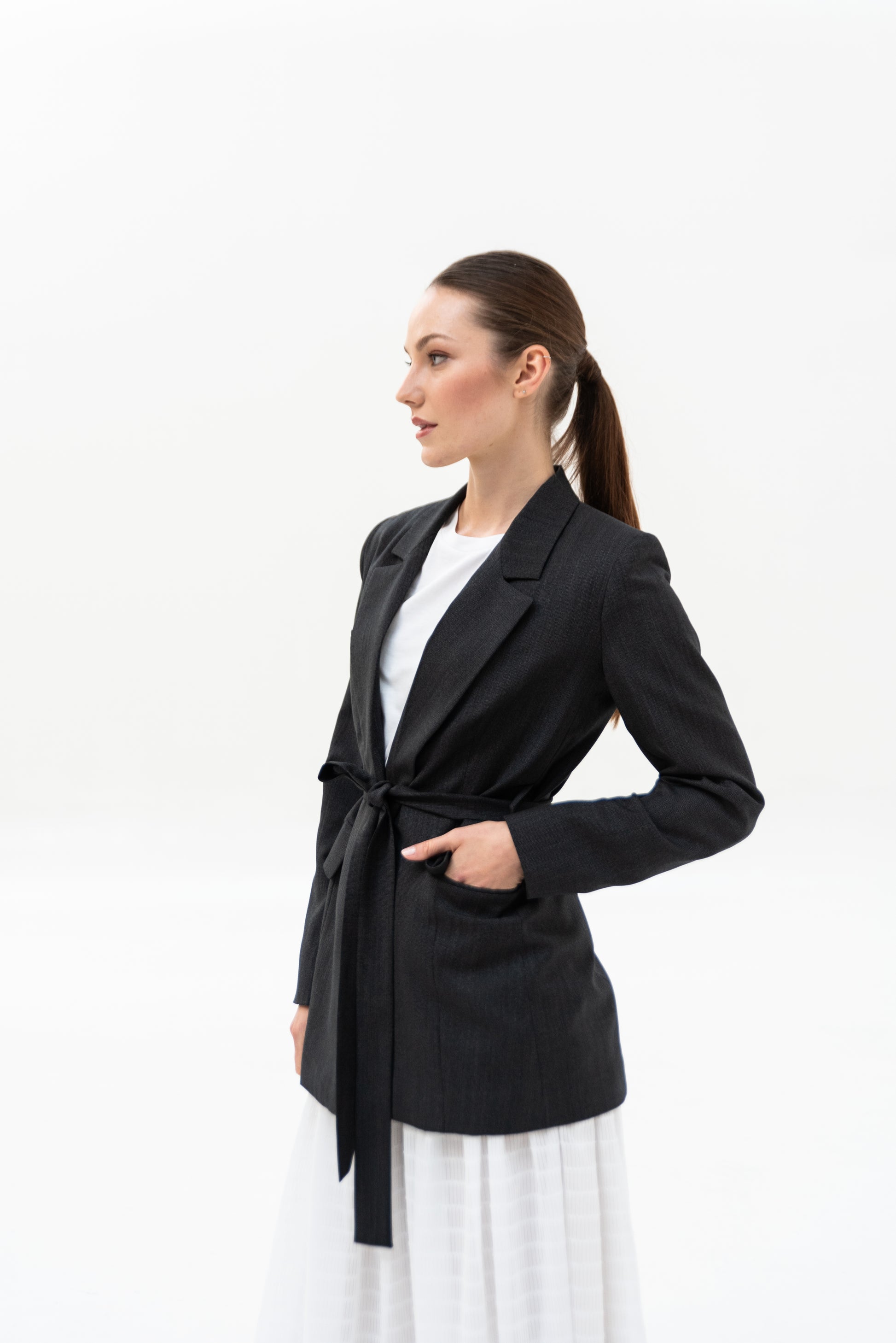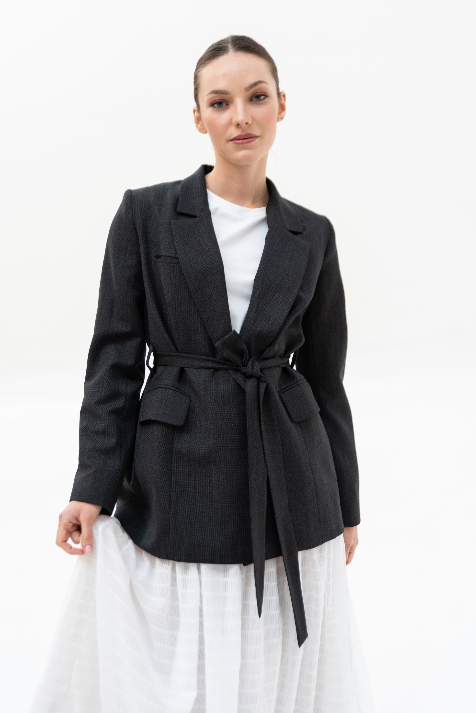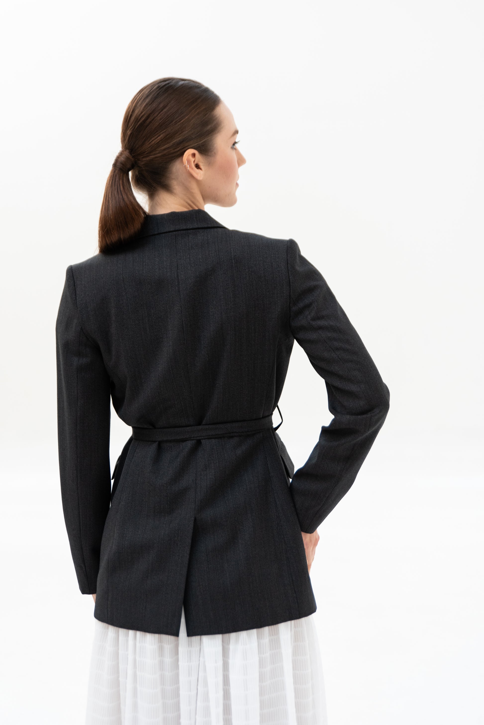 Sako klasického střihu s pánskými prvky. Sako je celopodšité a zapíná se pouze na zavazování, vzadu rozparek.