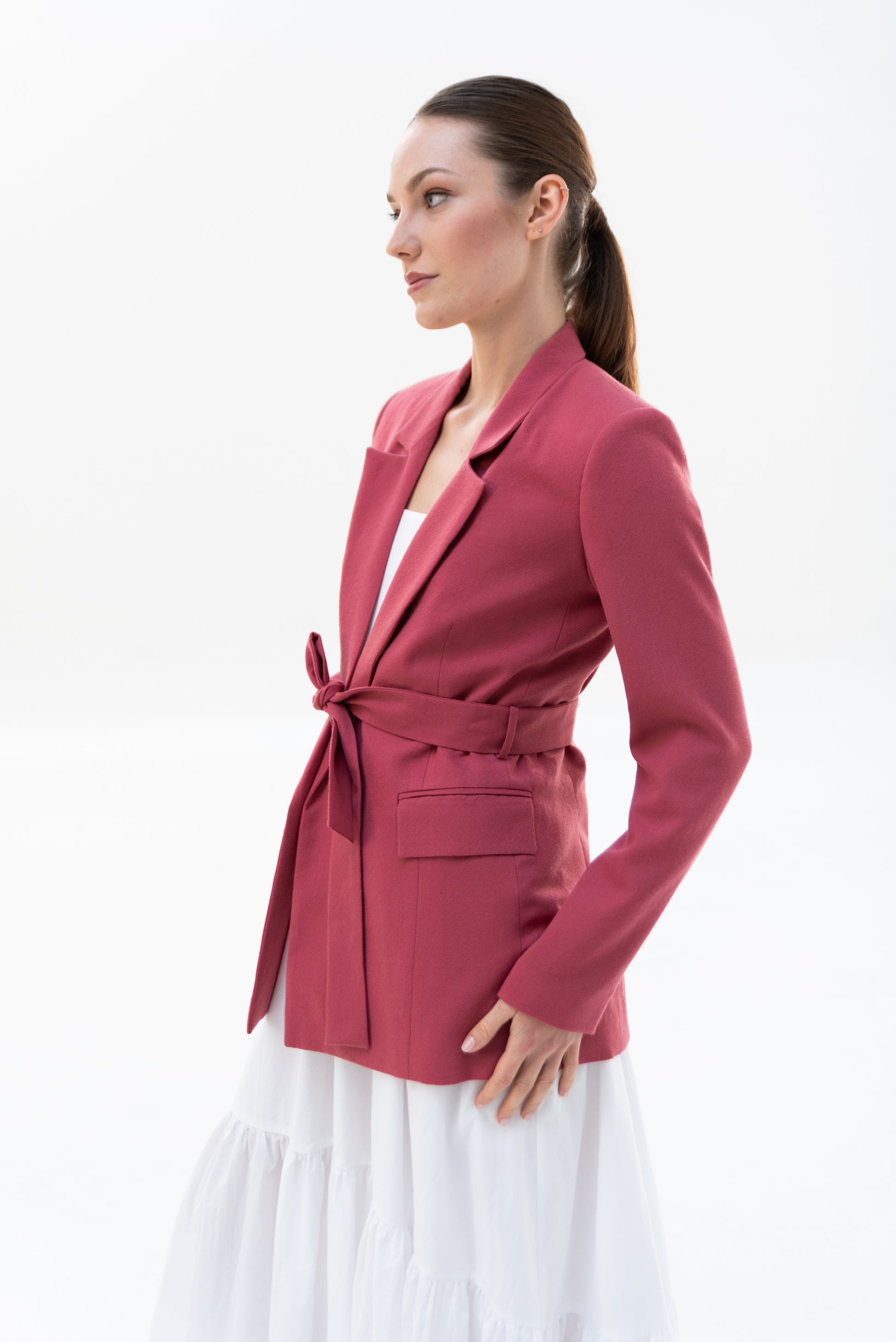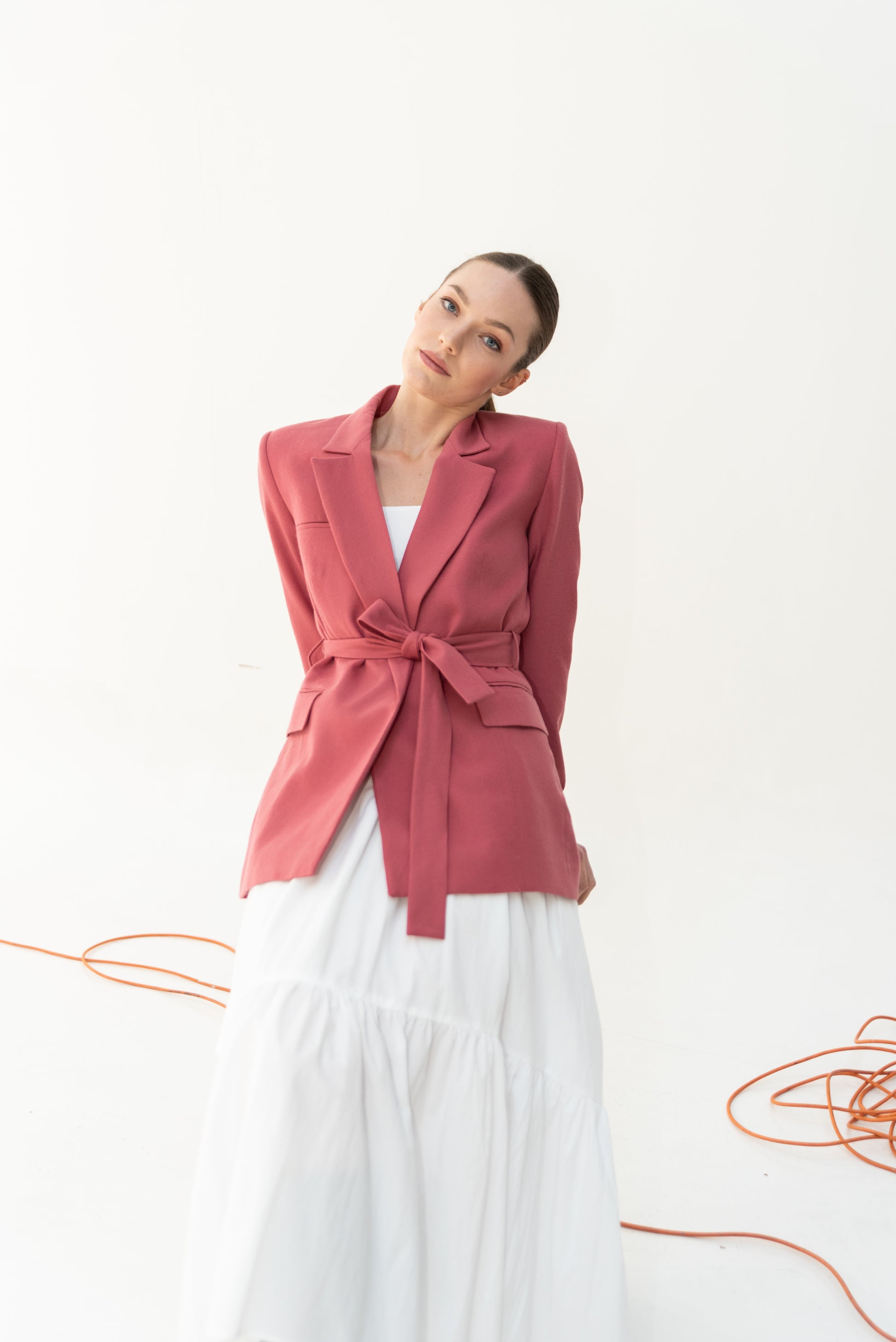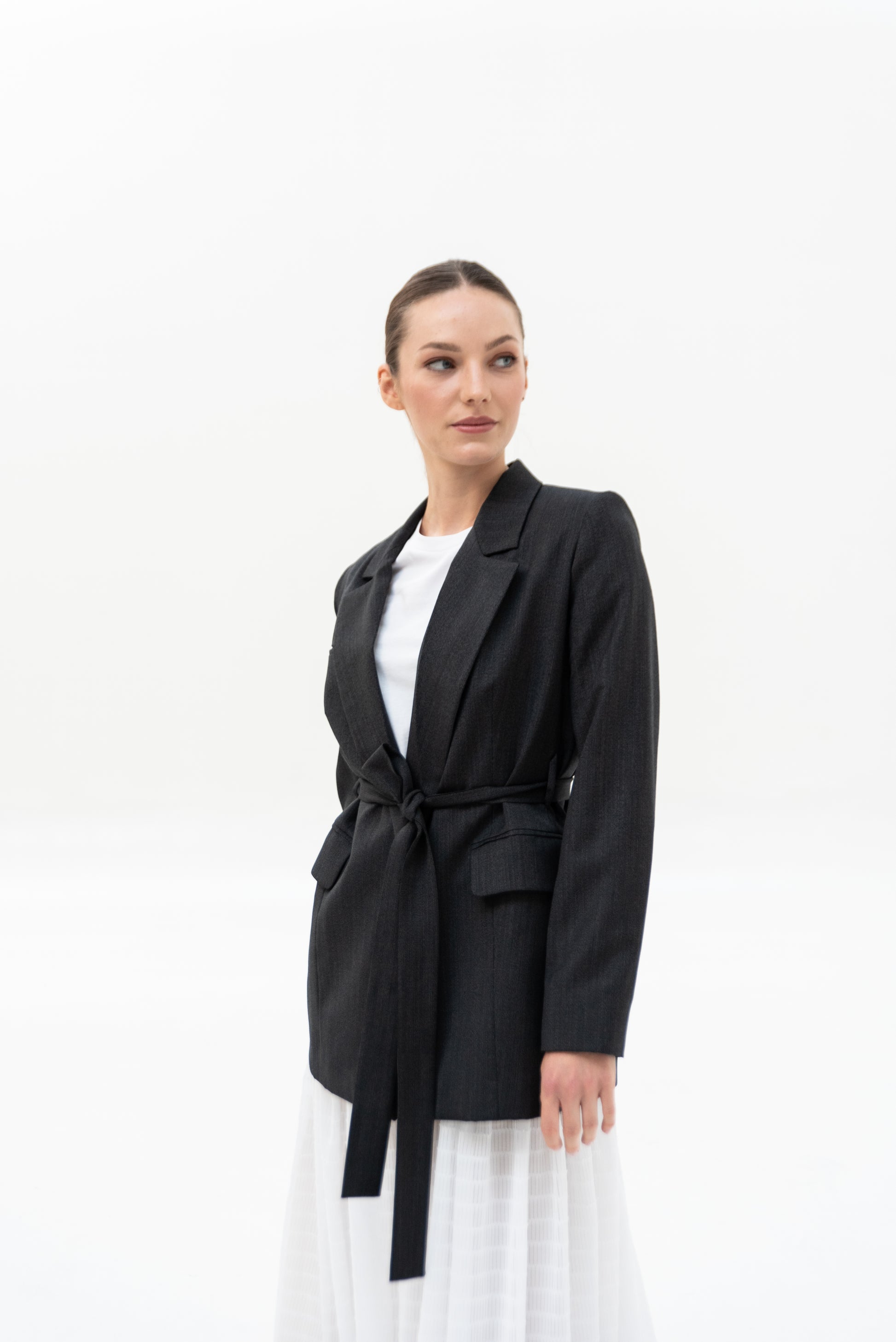 Sako klasického střihu s pánskými prvky. Sako je celopodšité a zapíná se pouze na zavazování, vzadu rozparek.