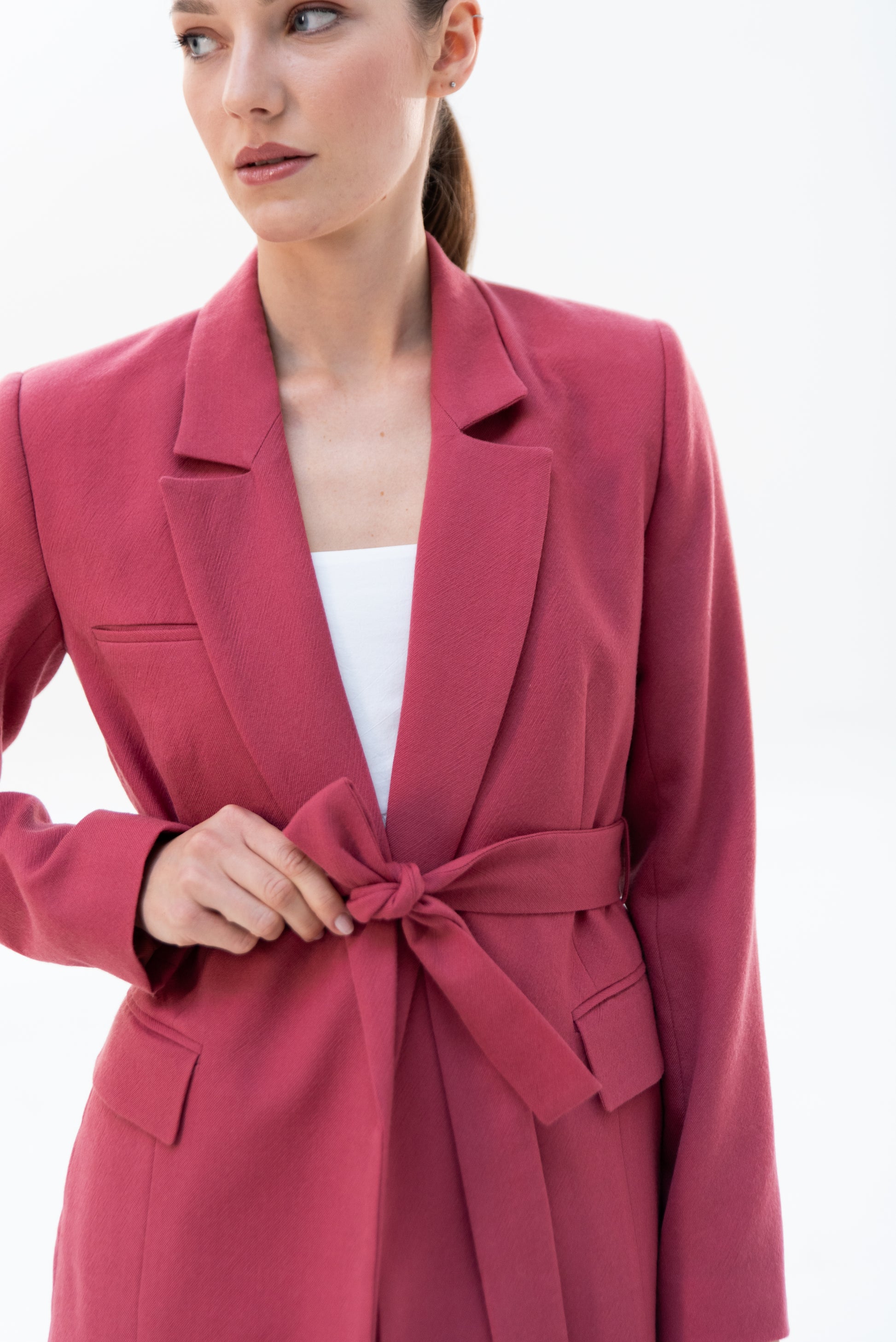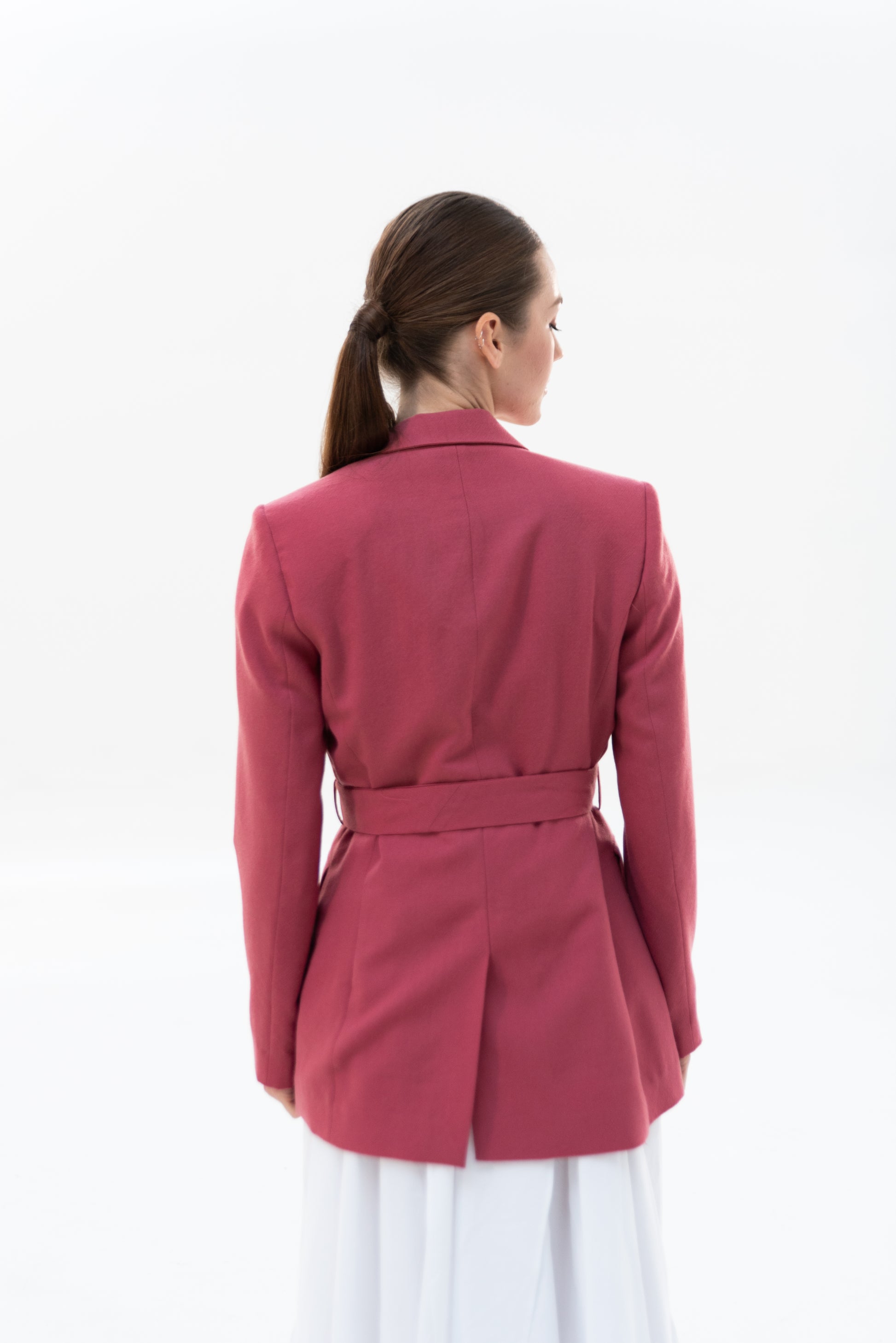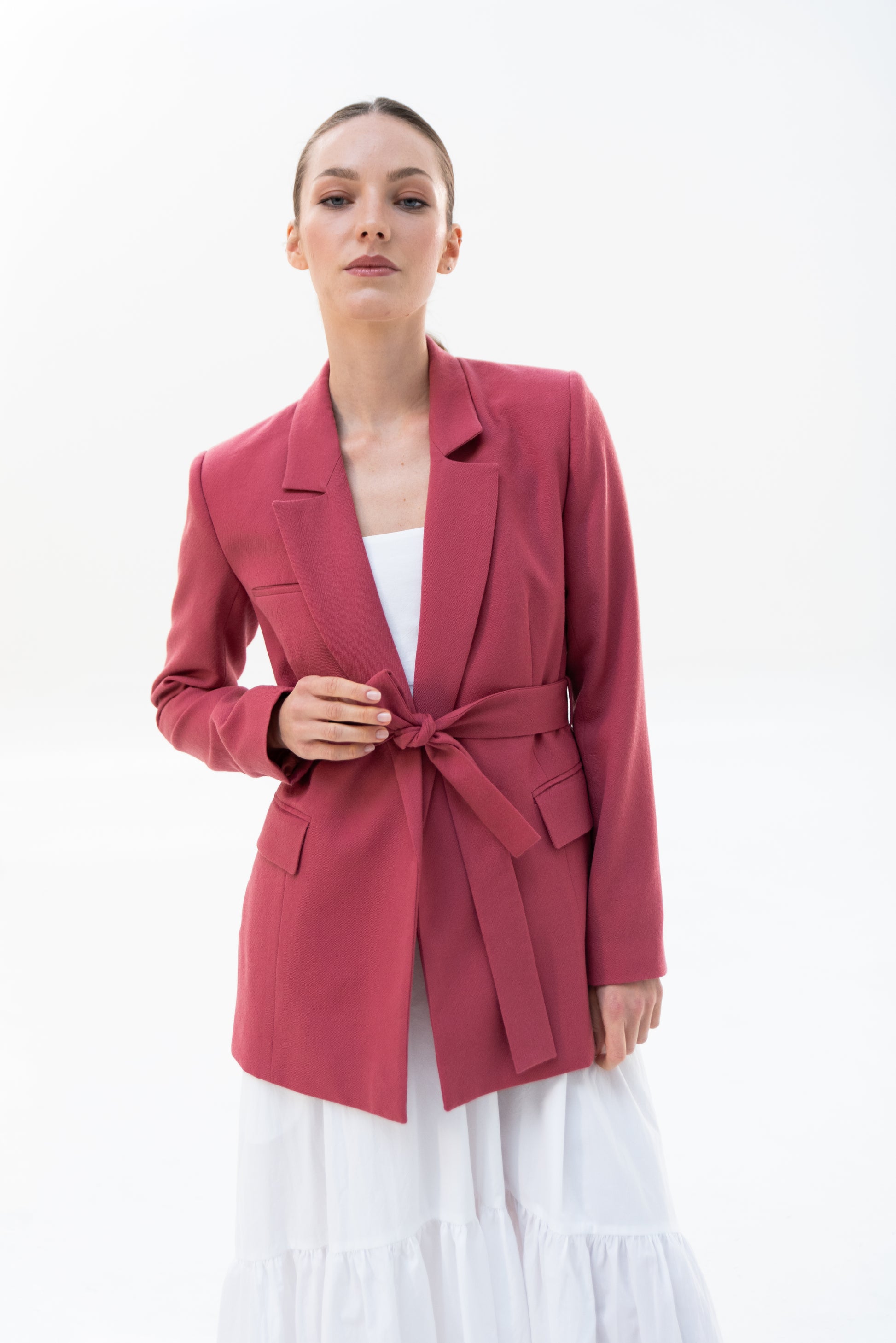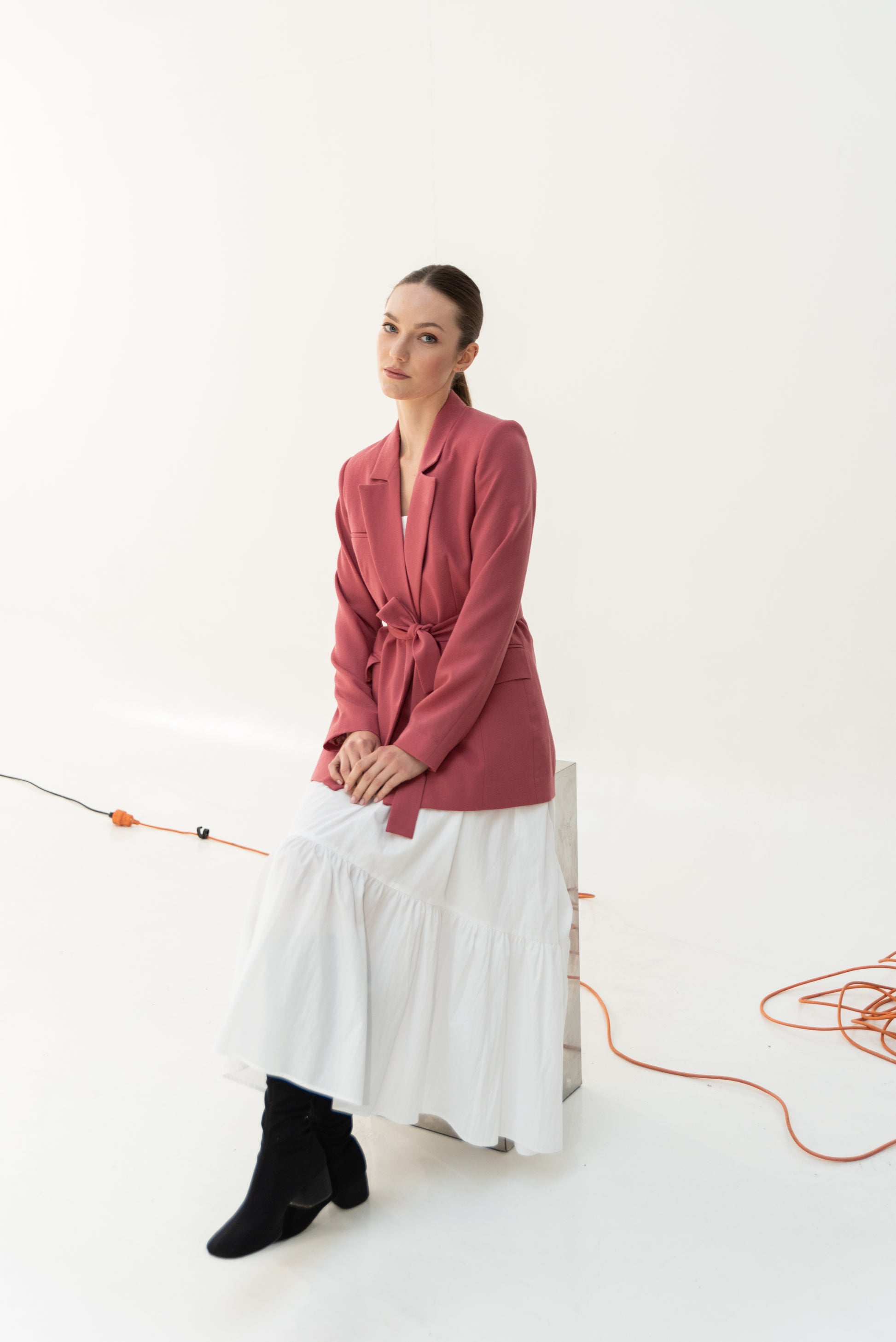 Sako klasického střihu s pánskými prvky. Sako je celopodšité a zapíná se pouze na zavazování, vzadu rozparek.