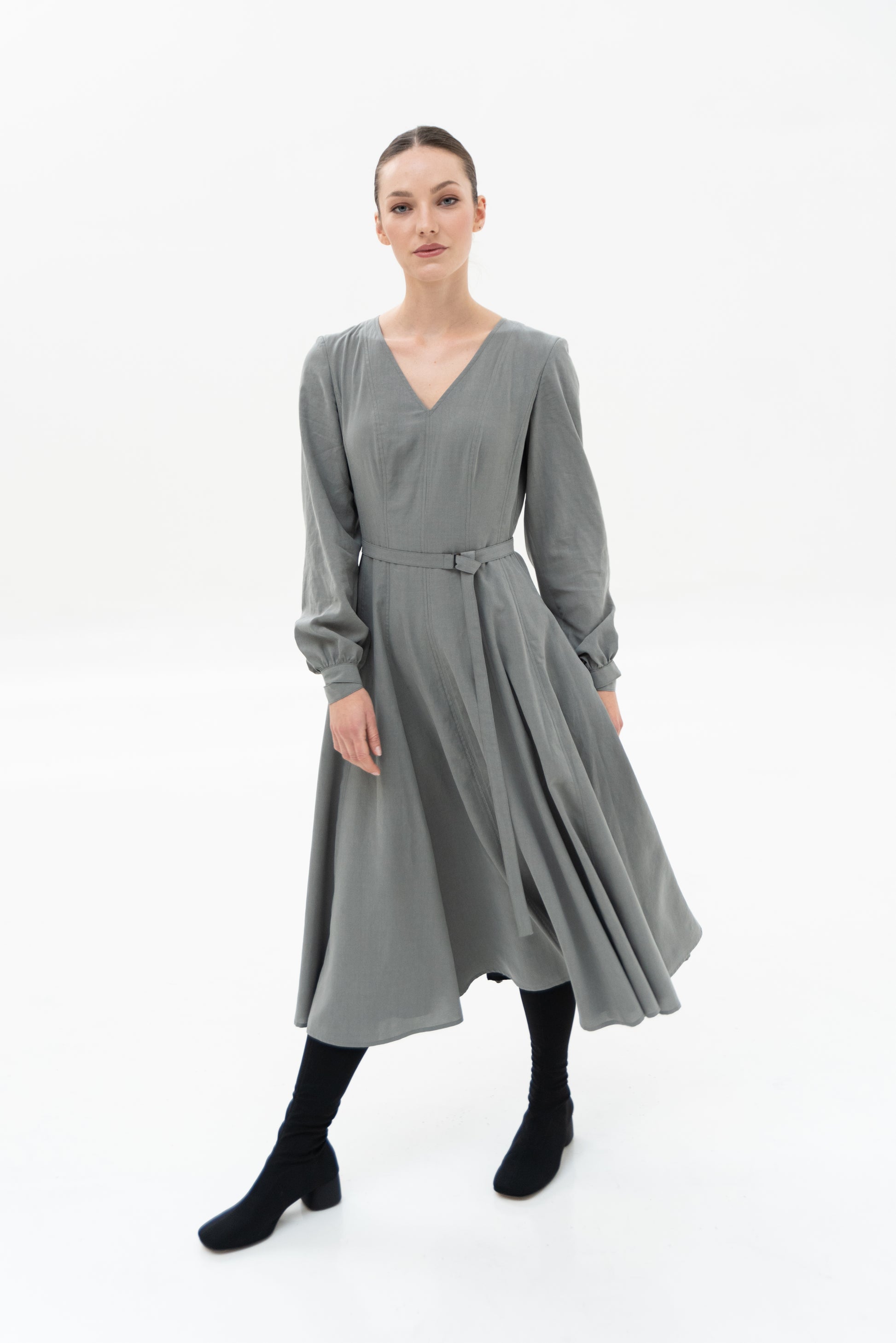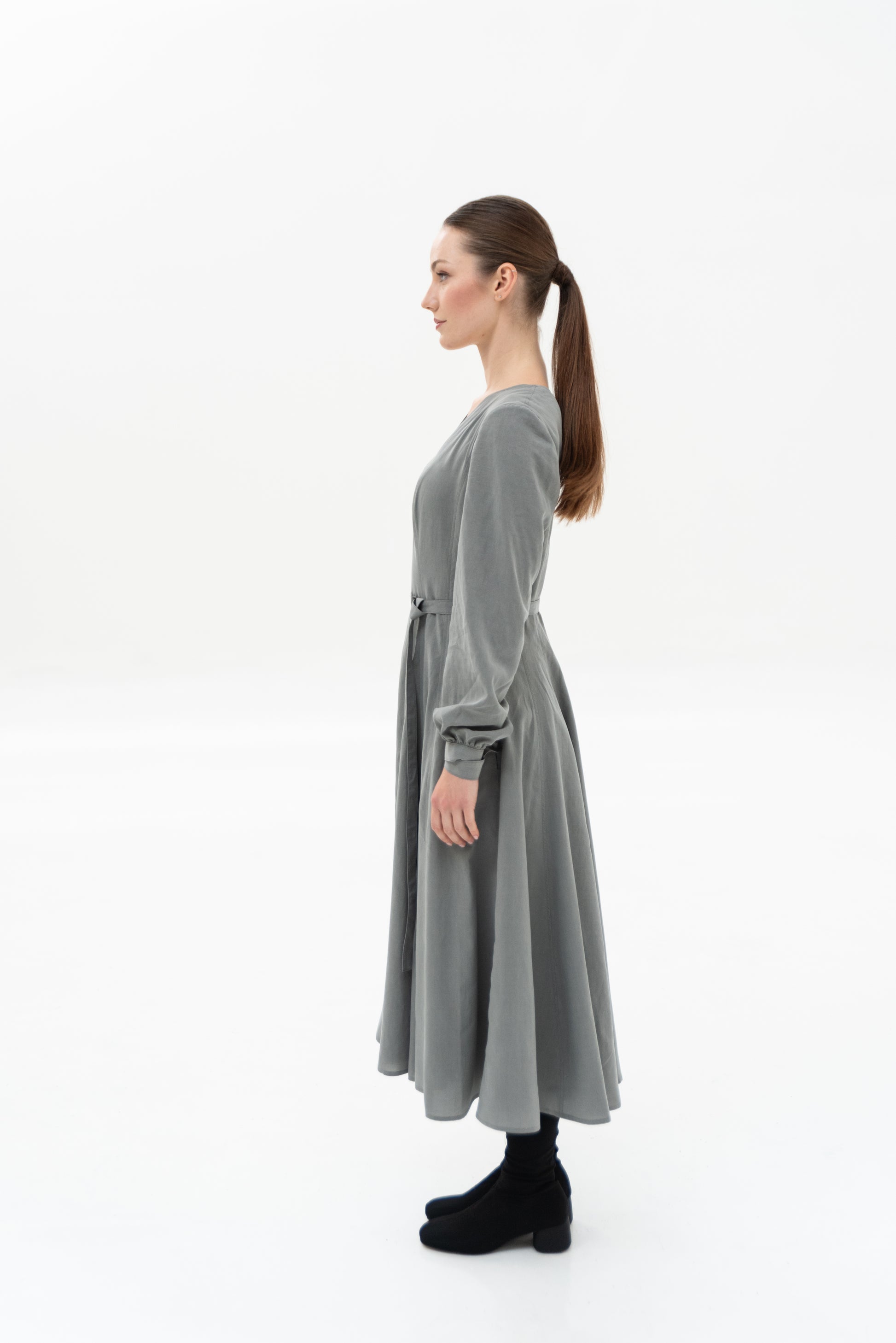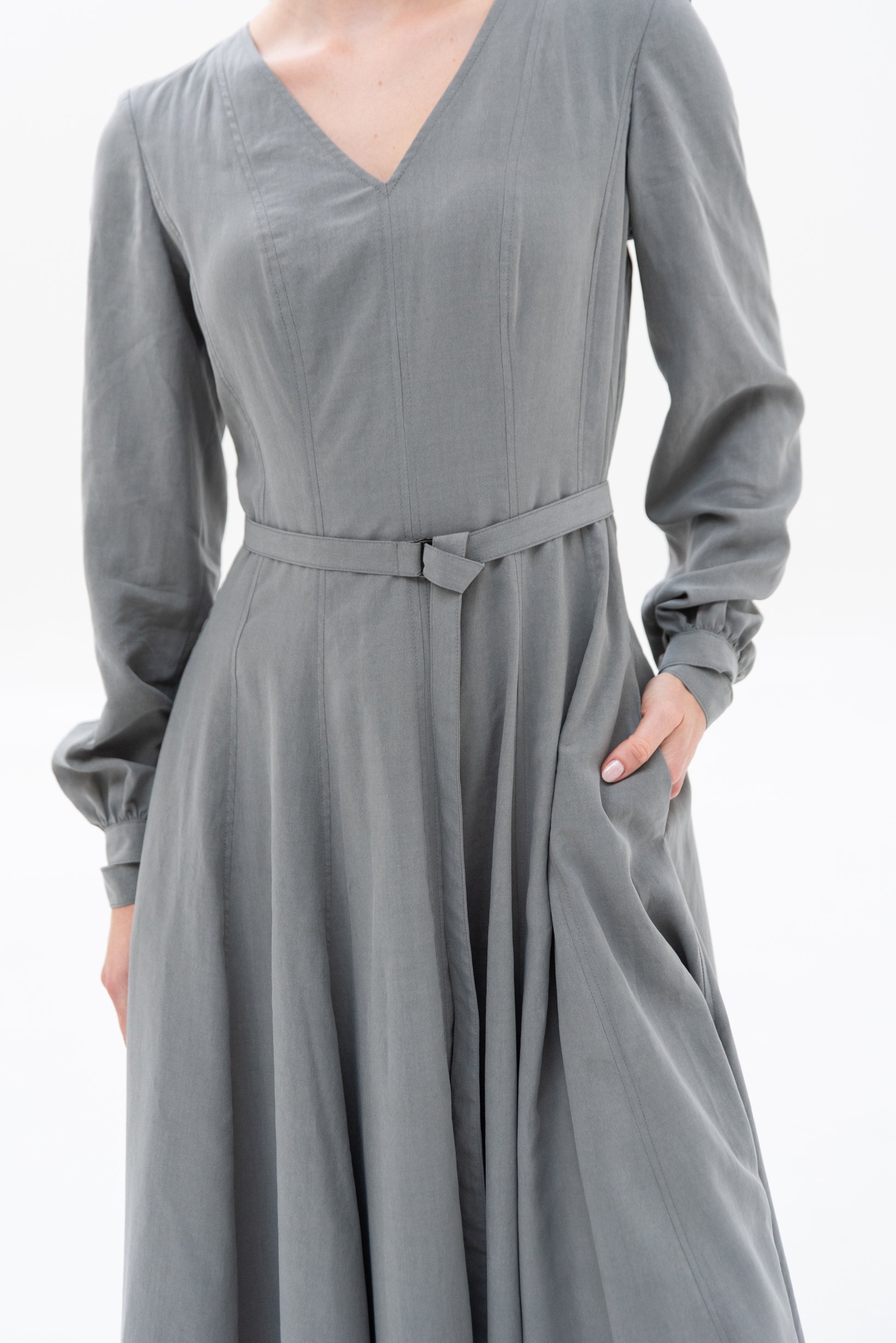 Minimalistické vypasované šaty z tencelu, V výstřih a košilový rukáv. Podzimní variace na oblíbené šaty Kleo. Šaty mají samozřejmě kapsy a jsou podšité jemným voálem.