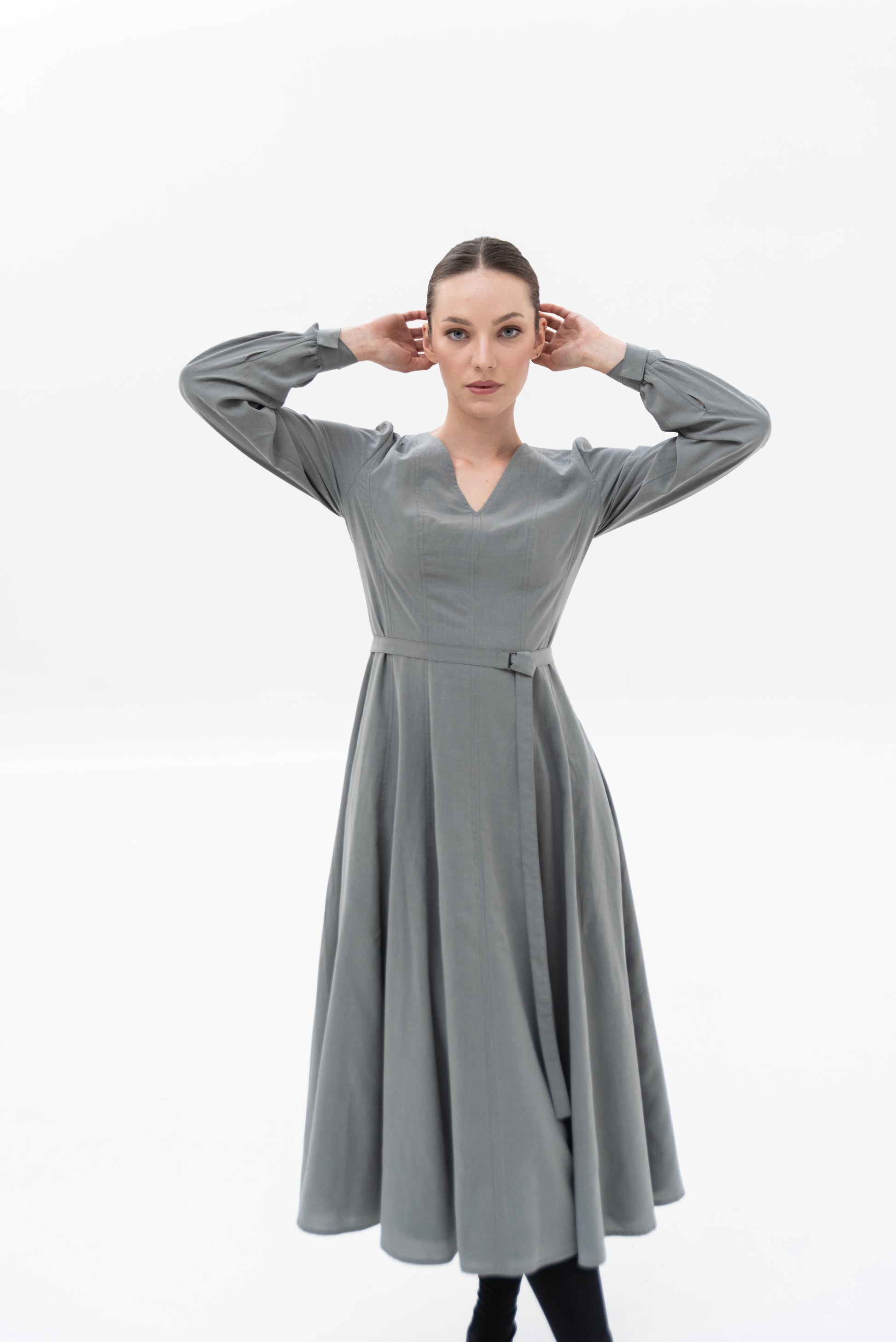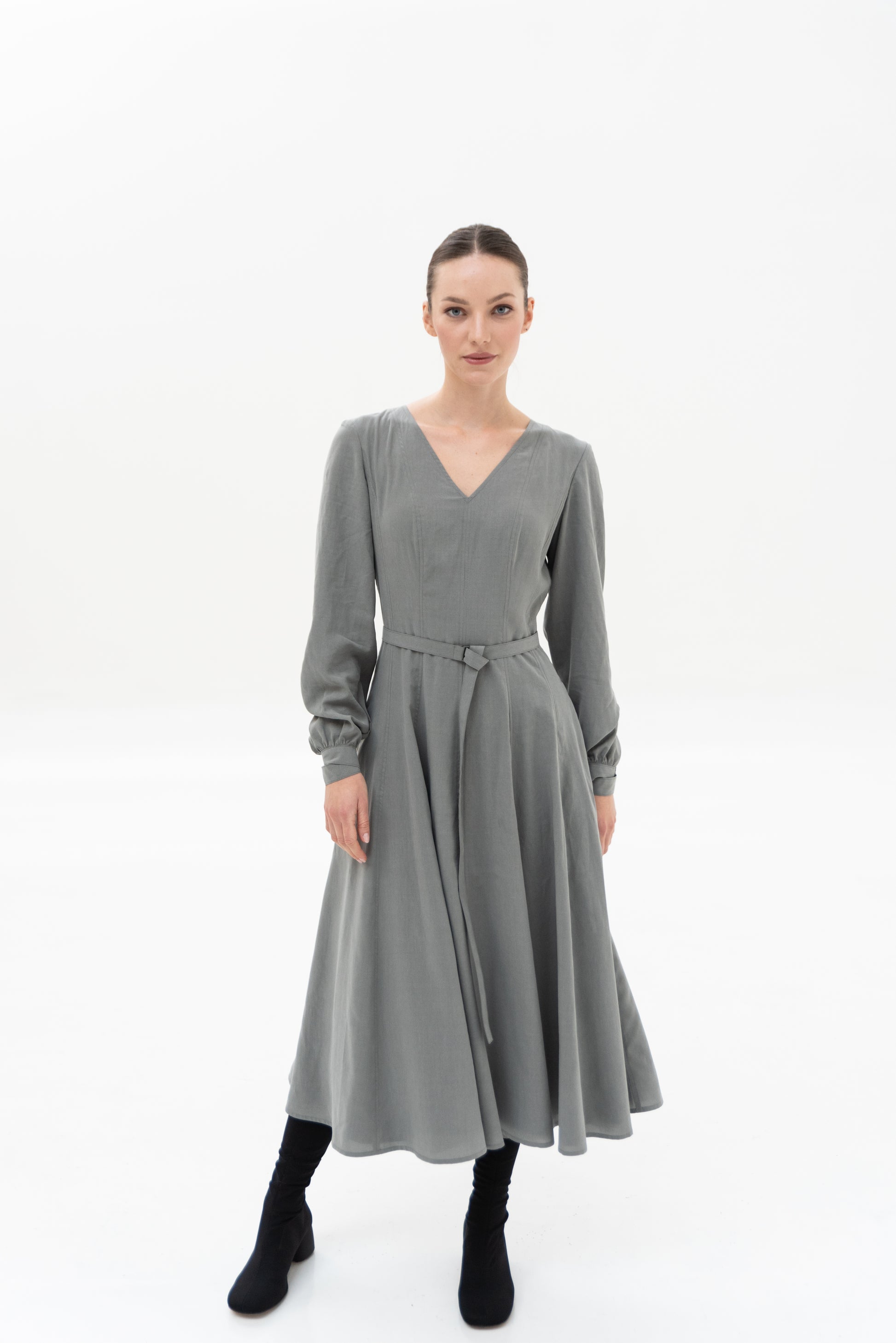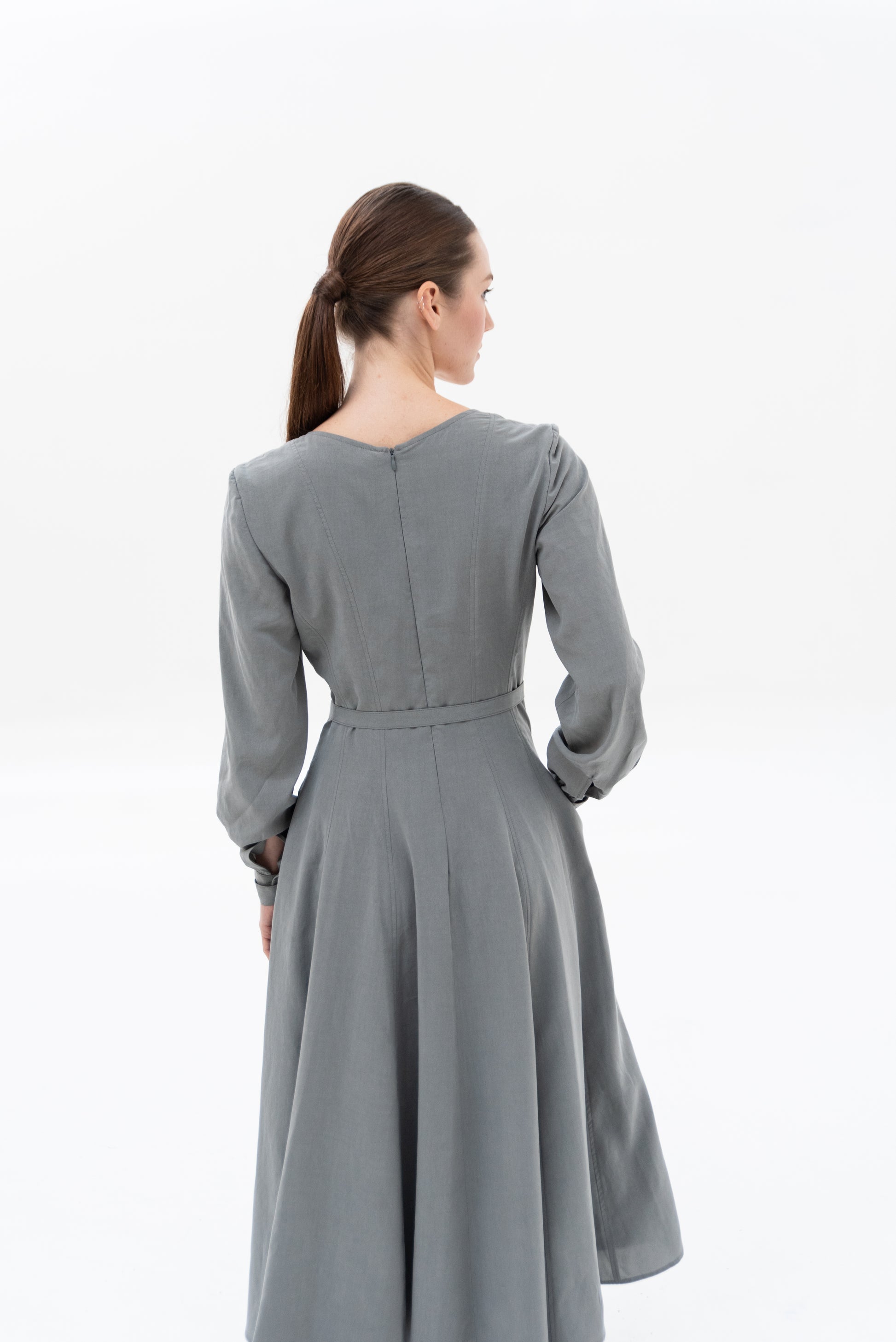 Minimalistické vypasované šaty z tencelu, V výstřih a košilový rukáv. Podzimní variace na oblíbené šaty Kleo. Šaty mají samozřejmě kapsy a jsou podšité jemným voálem.