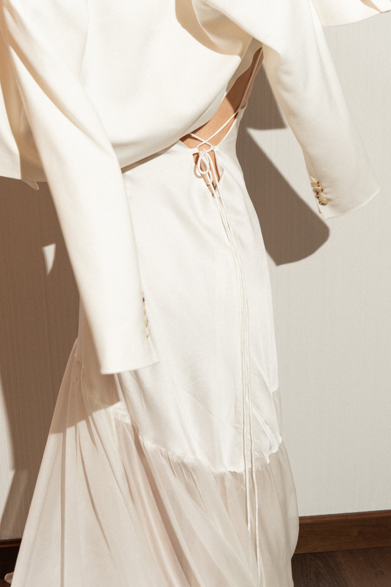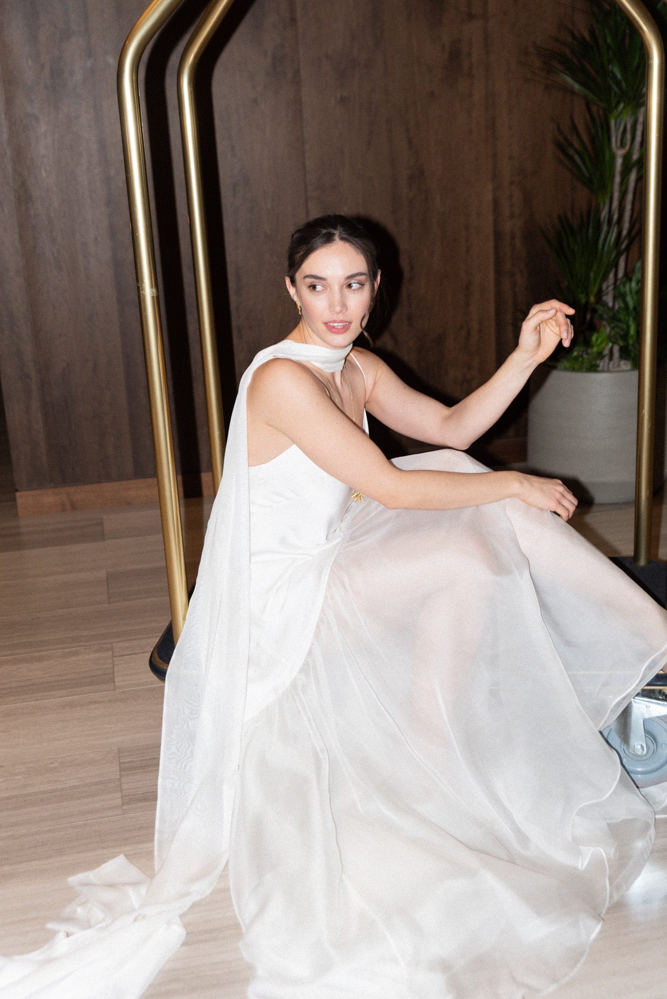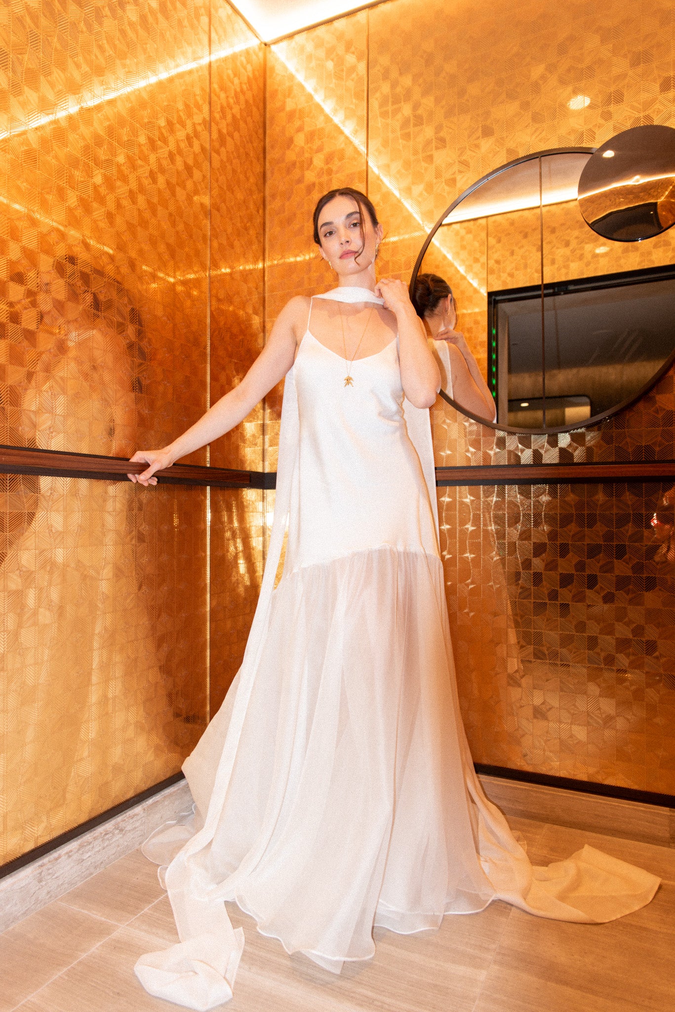 Jemné, minimalistické svatební šaty, které v sobě spojují jednoduchost a eleganci. Lesklý materiál krásně odráží světlo, zatímco čisté linie a subtilní ramínka podtrhují přirozenou ženskost a eleganci. Střih je navržený tak, aby lichotil postavě a zároveň působil vzdušně a nenuceně.