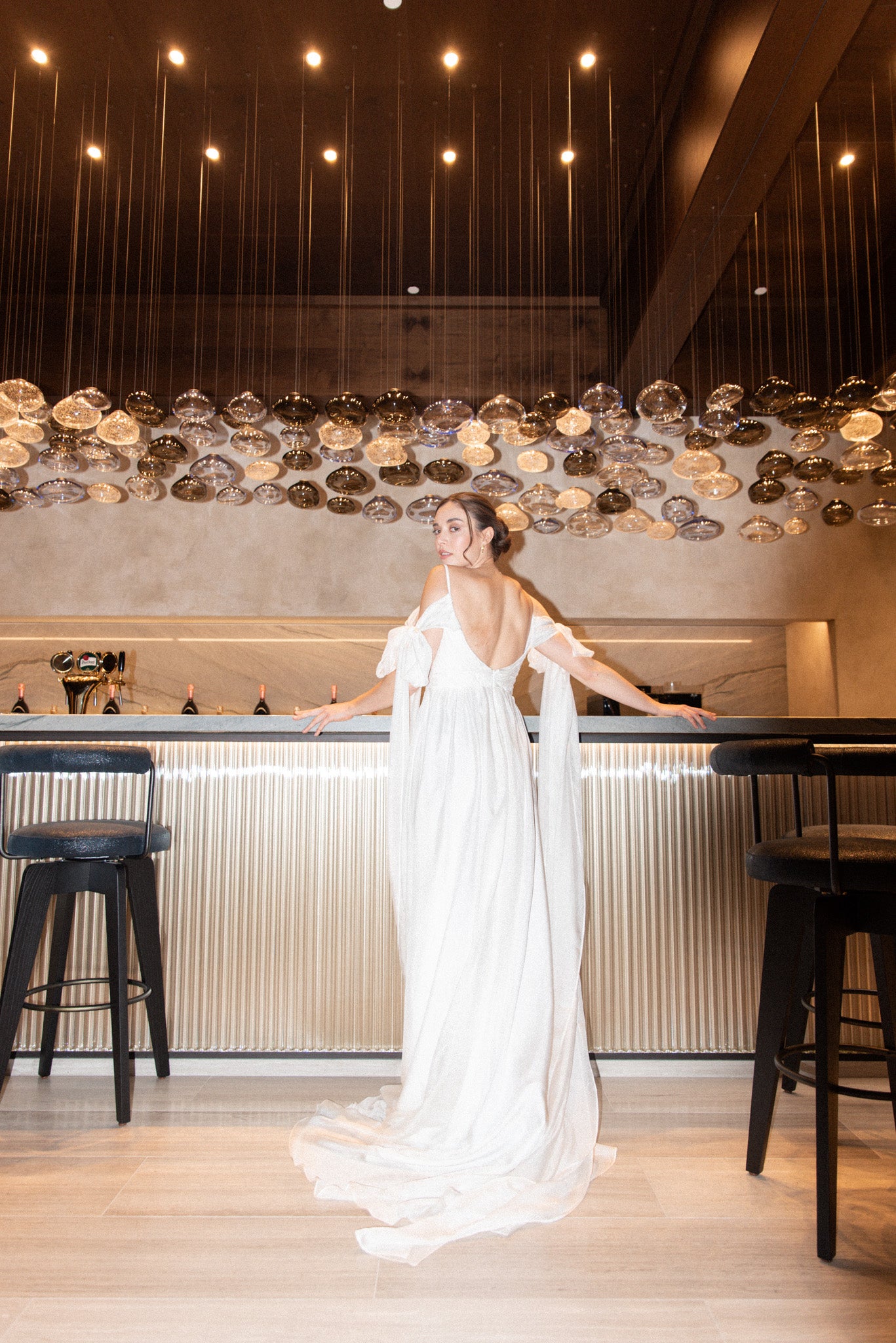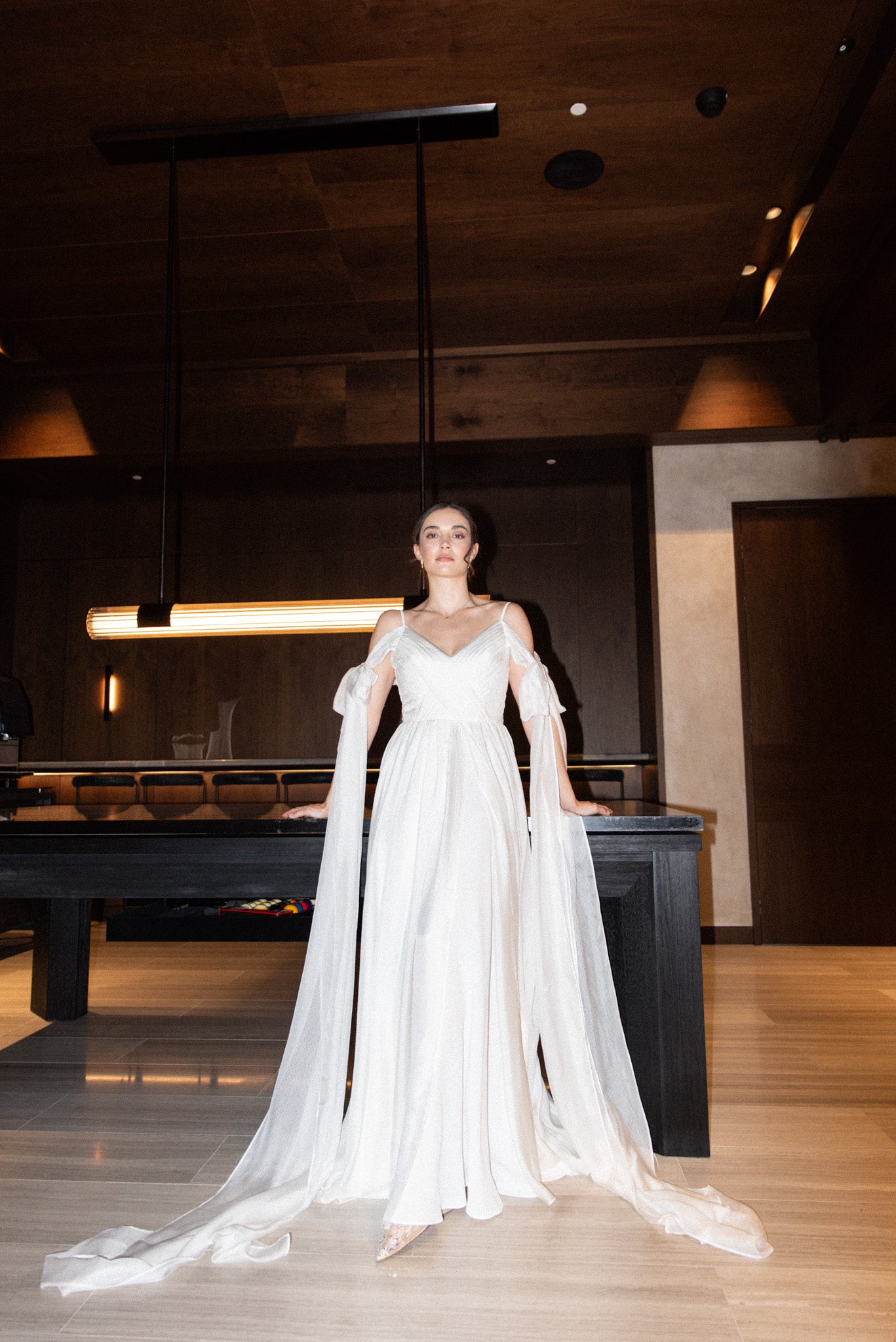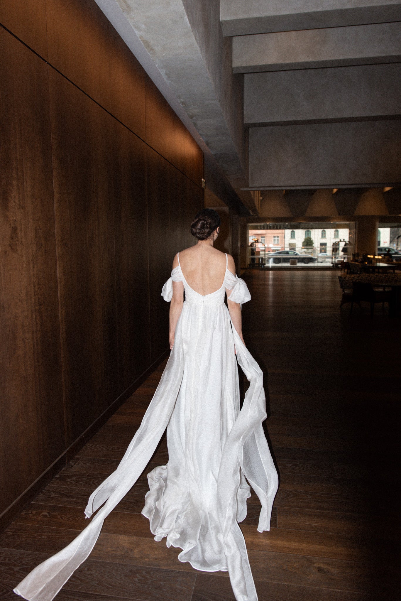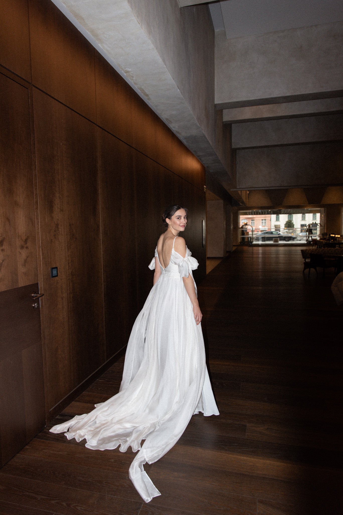 Lehké svatební šaty z jemného hedvábí, které okouzlí svou vzdušností a nadčasovou elegancí. Šaty mají lehkou texturu, krásně splývají a pohybují se s každým krokem. Výrazné mašle na rukávech dodávají modelu hravý romantický detail, zatímco dlouhá vlečka podtrhuje slavnostní charakter. Rozparek ve spodní části přináší komfort i volnost pohybu.