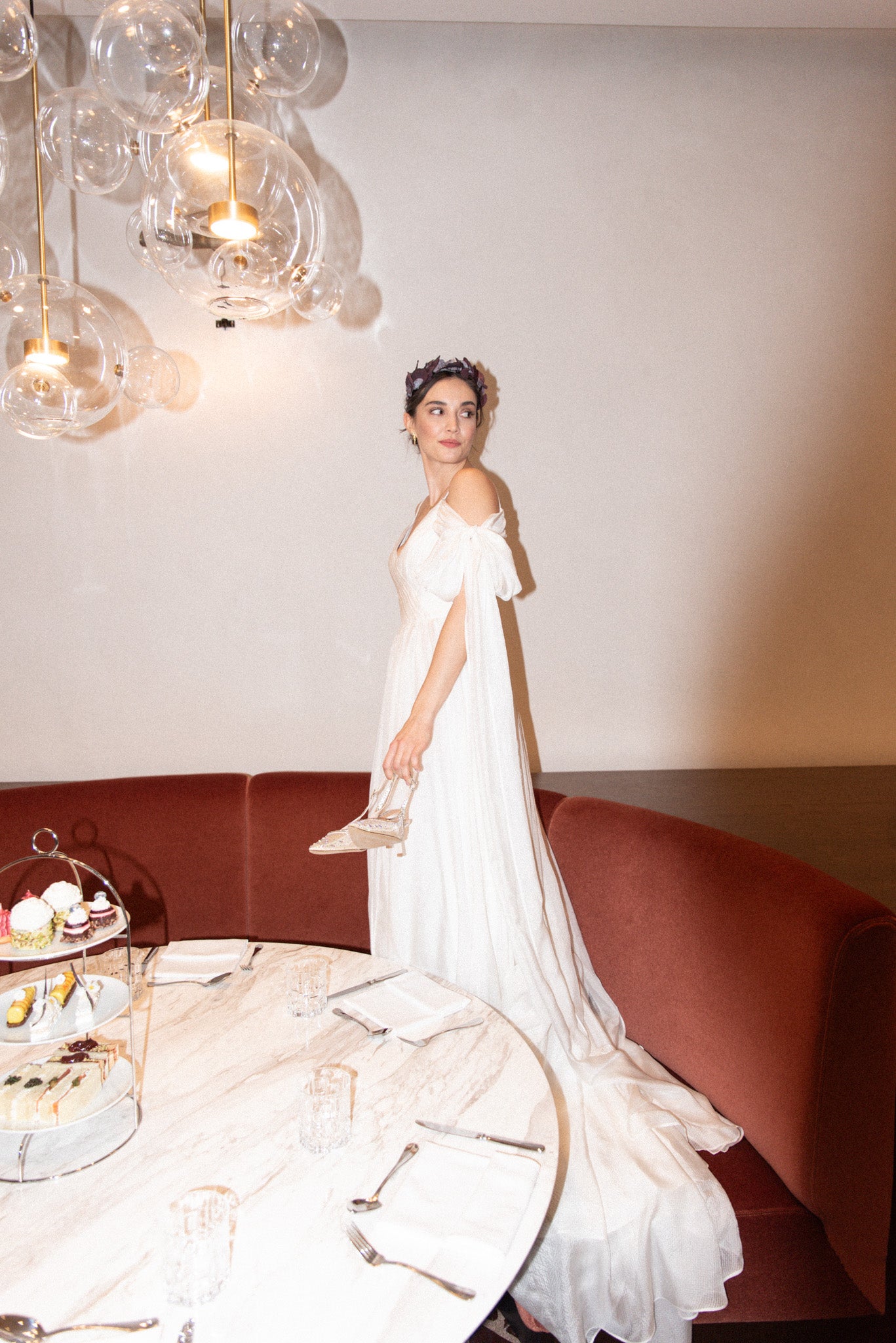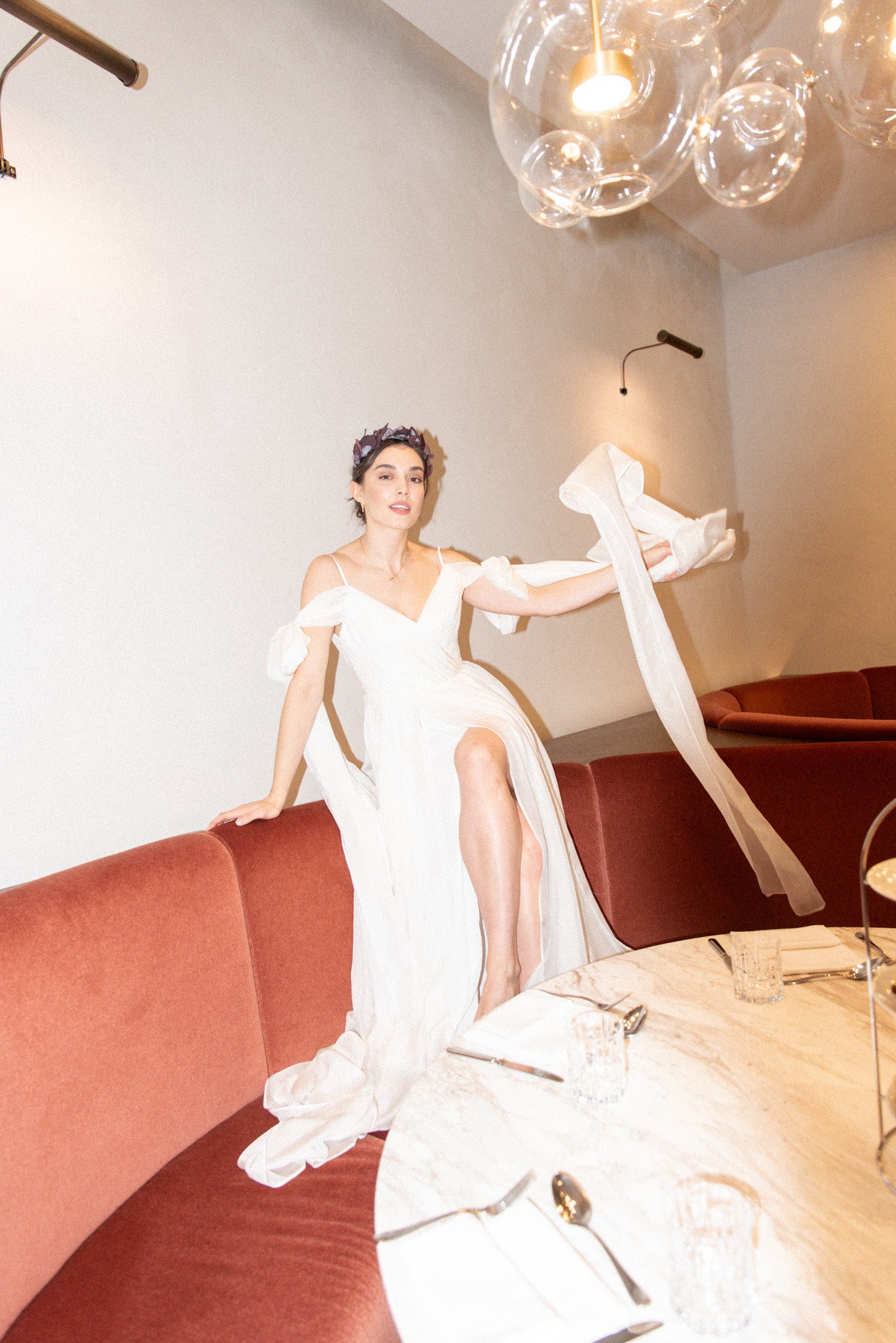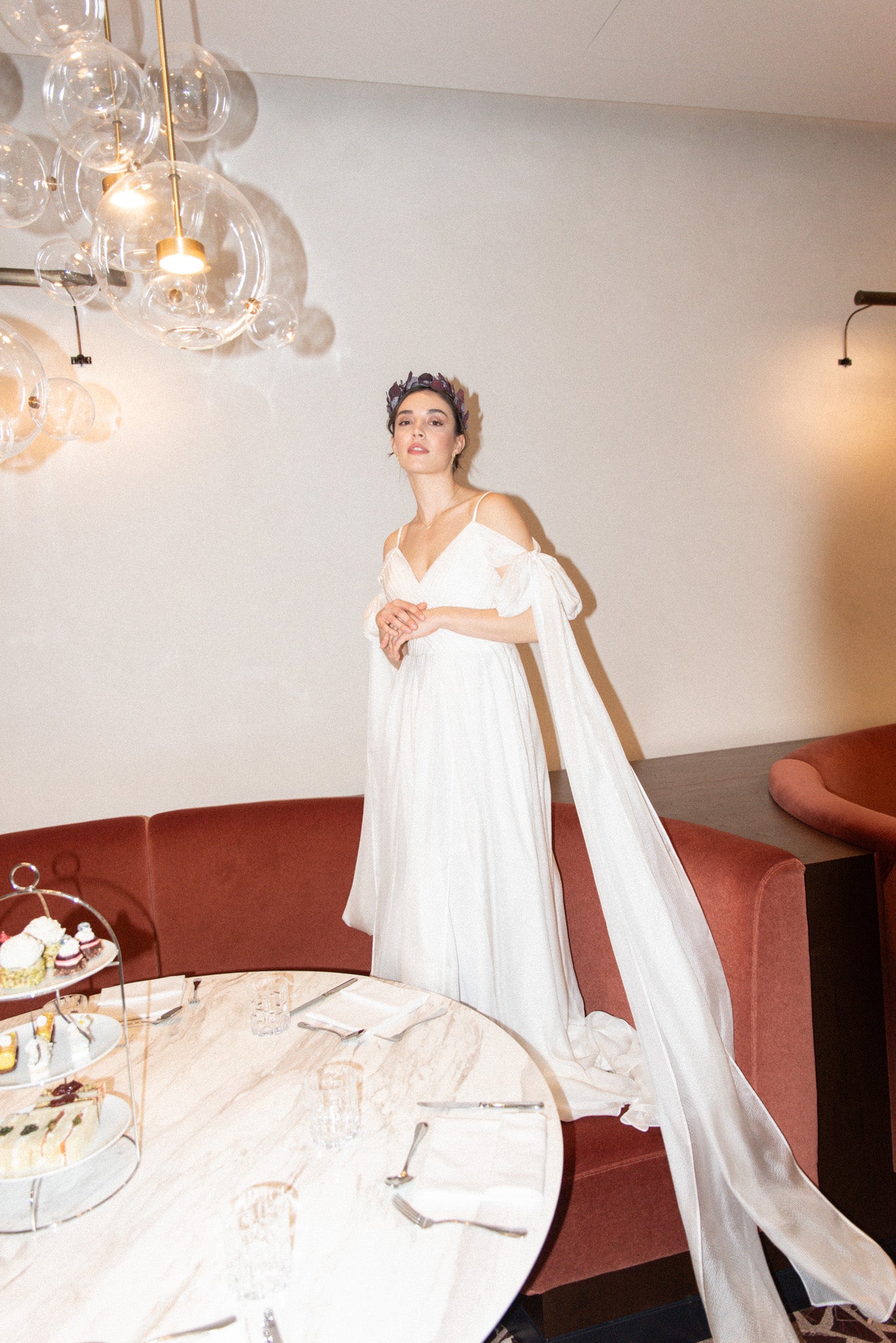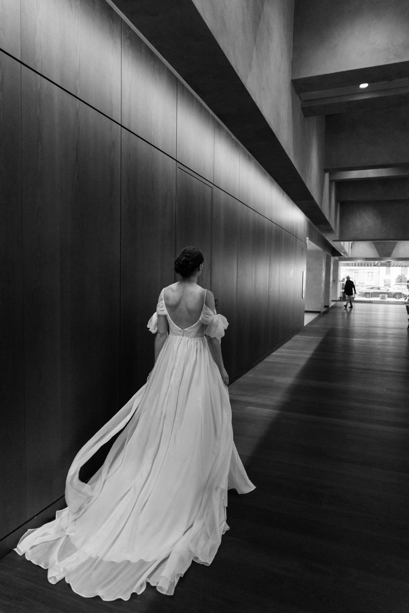 Lehké svatební šaty z jemného hedvábí, které okouzlí svou vzdušností a nadčasovou elegancí. Šaty mají lehkou texturu, krásně splývají a pohybují se s každým krokem. Výrazné mašle na rukávech dodávají modelu hravý romantický detail, zatímco dlouhá vlečka podtrhuje slavnostní charakter. Rozparek ve spodní části přináší komfort i volnost pohybu.