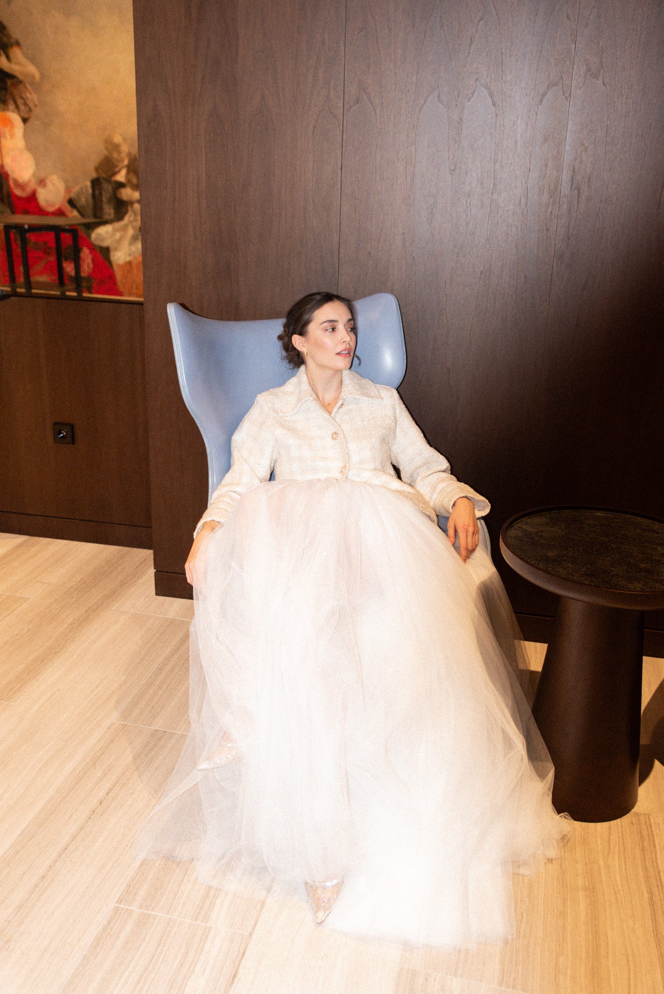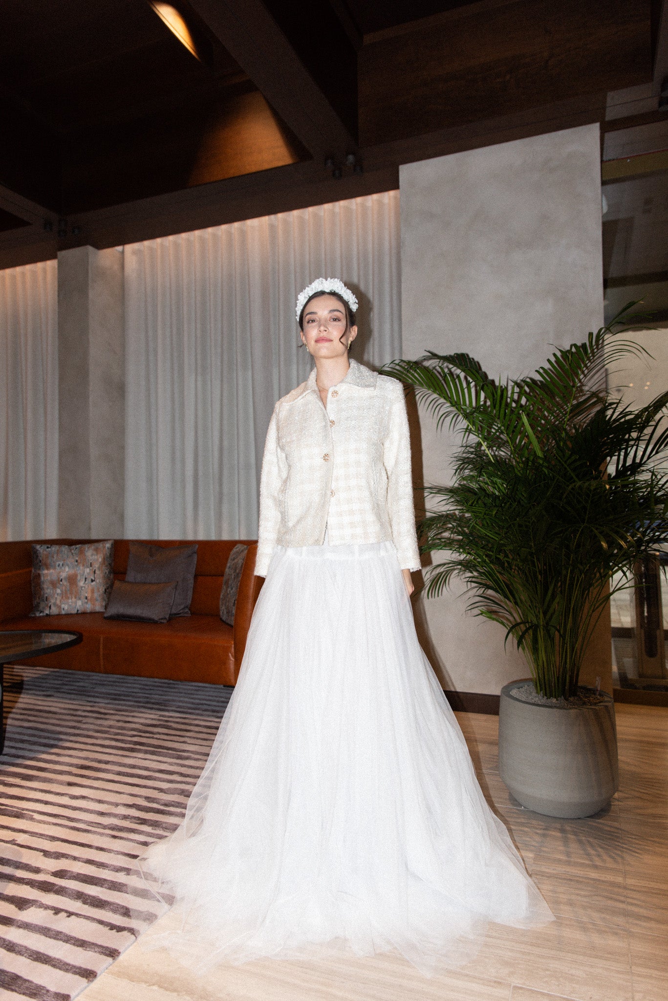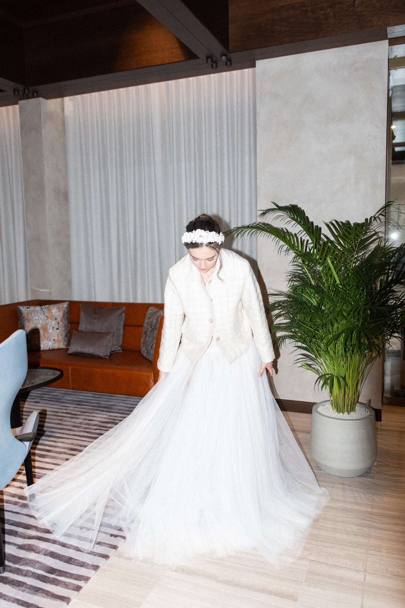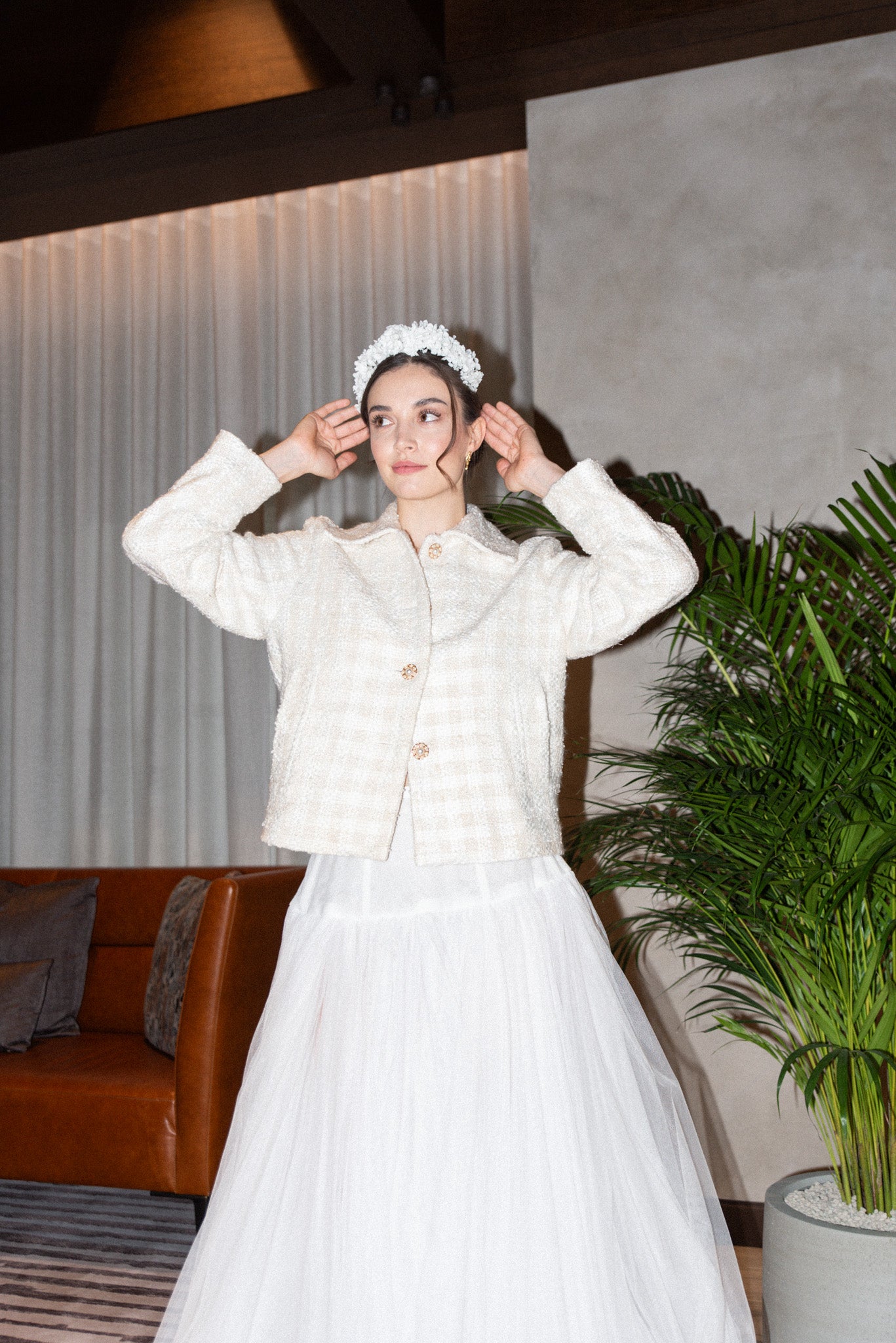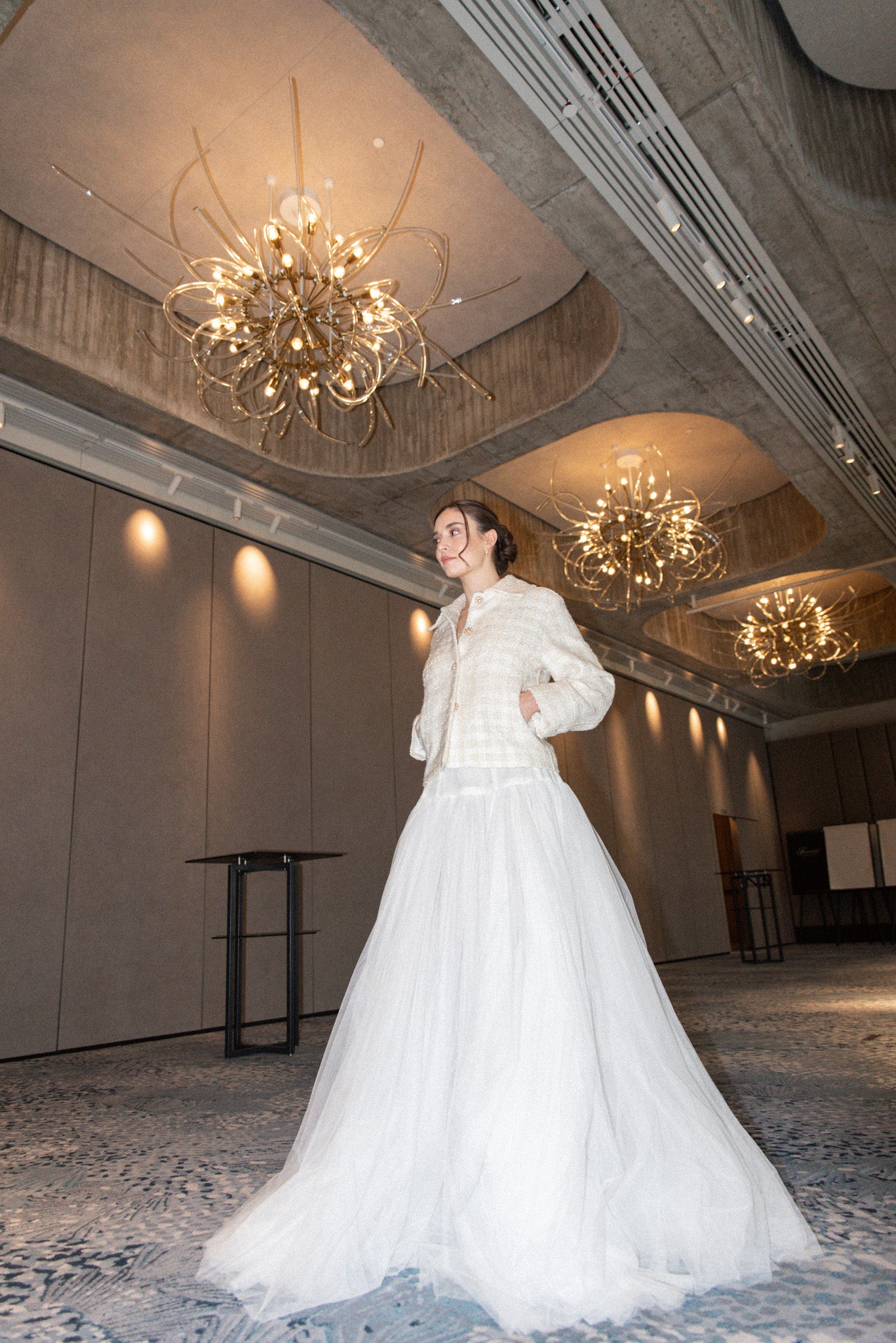 Majestátní tylová svatební sukně s výrazným objemem a bohatým řasením od boků. Sukně je inspirovaná klasickou spodničkou, ale v moderním, vzdušném pojetí. Díky několika vrstvám jemného tylu působí lehce, průsvitně a zároveň vytváří nádherný siluetový efekt při pohybu. Spousta materiálu zajišťuje skutečně slavnostní dojem a pocit výjimečnosti.