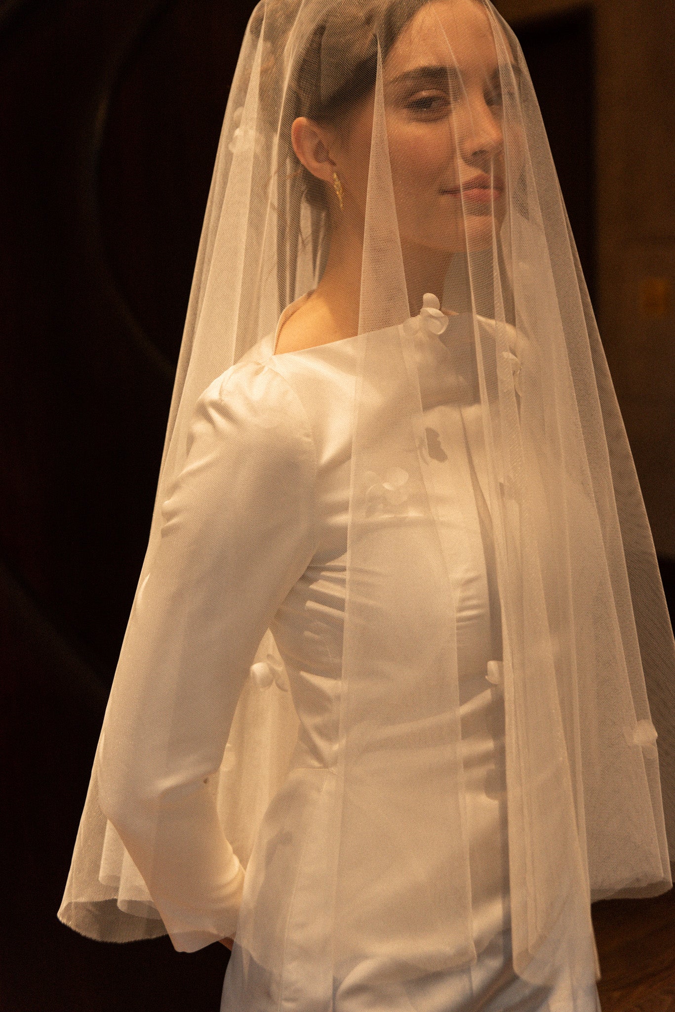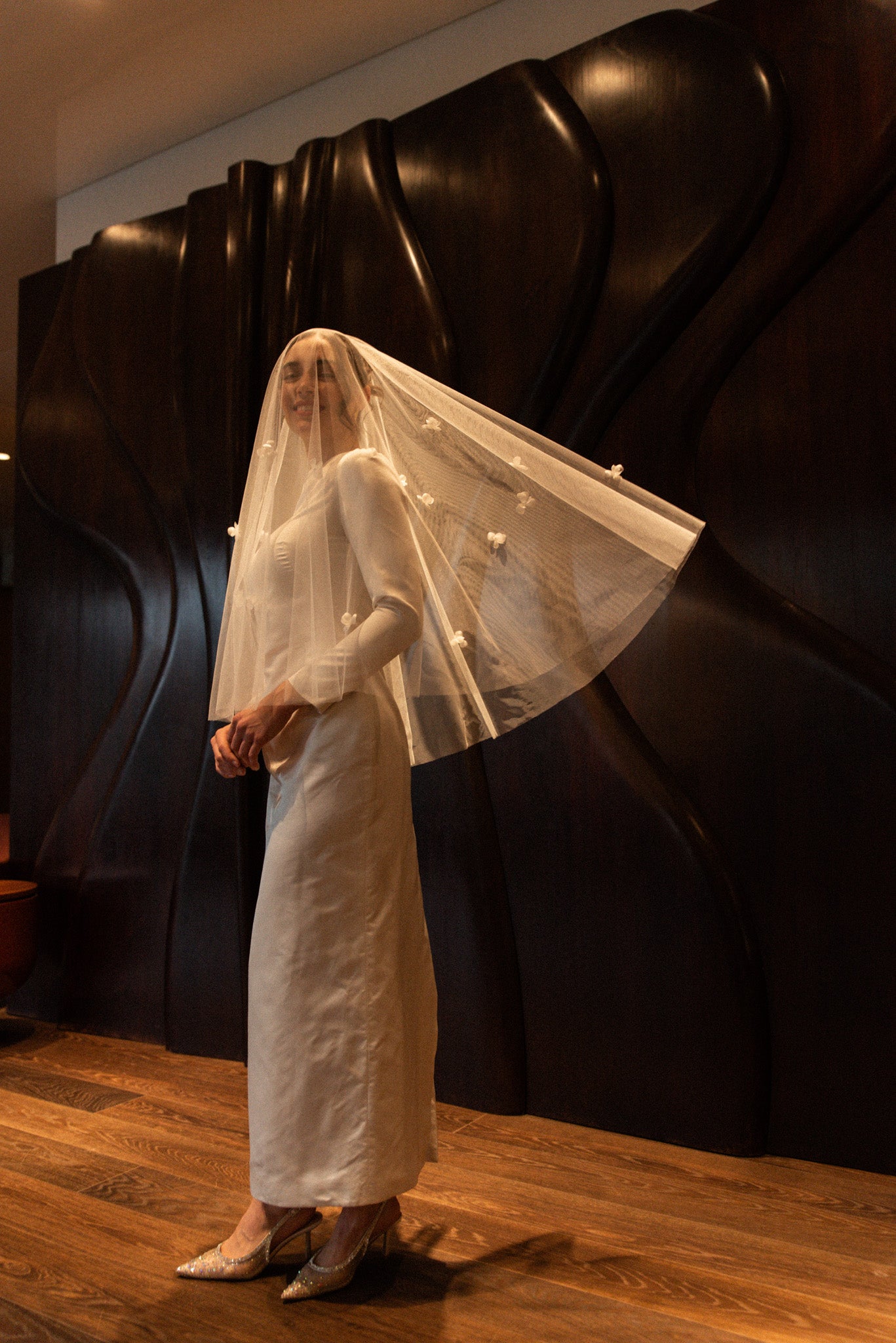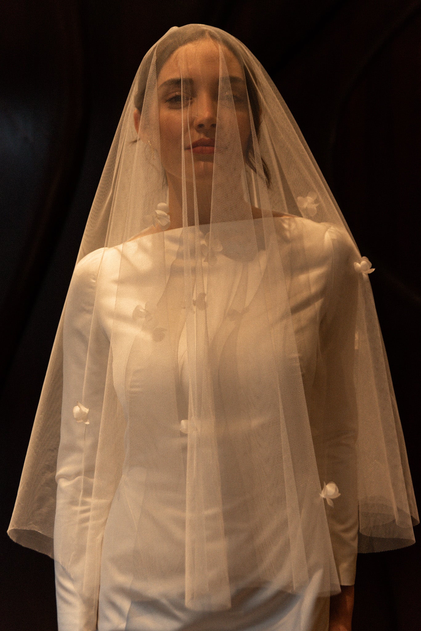 Jemný svatební závoj z lehkého tylu, zdobený ručně našitými 3D květy. Minimalistický, ale zároveň romantický doplněk, který krásně doplní jakékoli svatební šaty. Závoj jemně splývá přes ramena a obličej, vytváří éterický efekt a podtrhuje slavnostní atmosféru celého dne.
