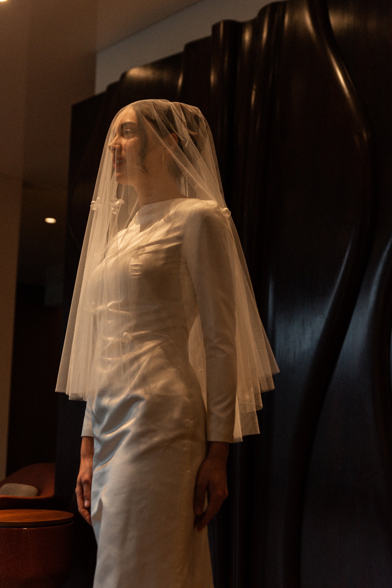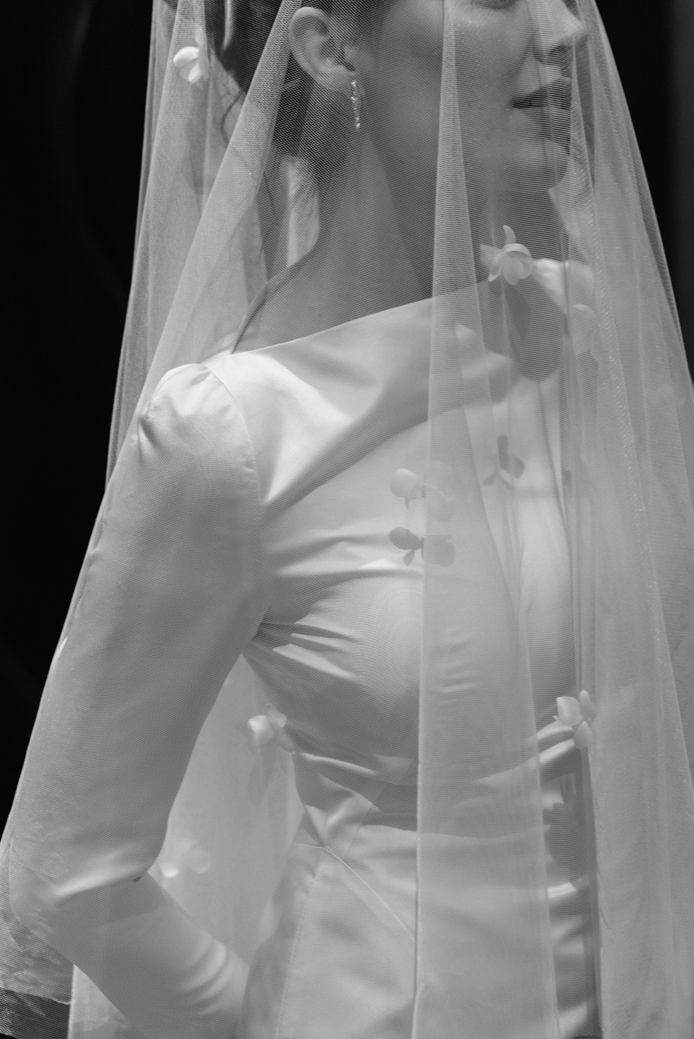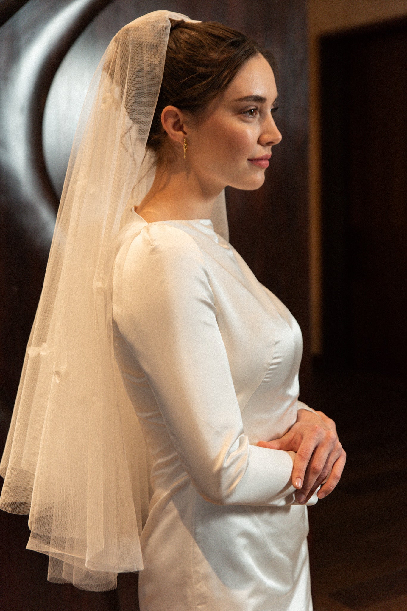 Jemný svatební závoj z lehkého tylu, zdobený ručně našitými 3D květy. Minimalistický, ale zároveň romantický doplněk, který krásně doplní jakékoli svatební šaty. Závoj jemně splývá přes ramena a obličej, vytváří éterický efekt a podtrhuje slavnostní atmosféru celého dne.