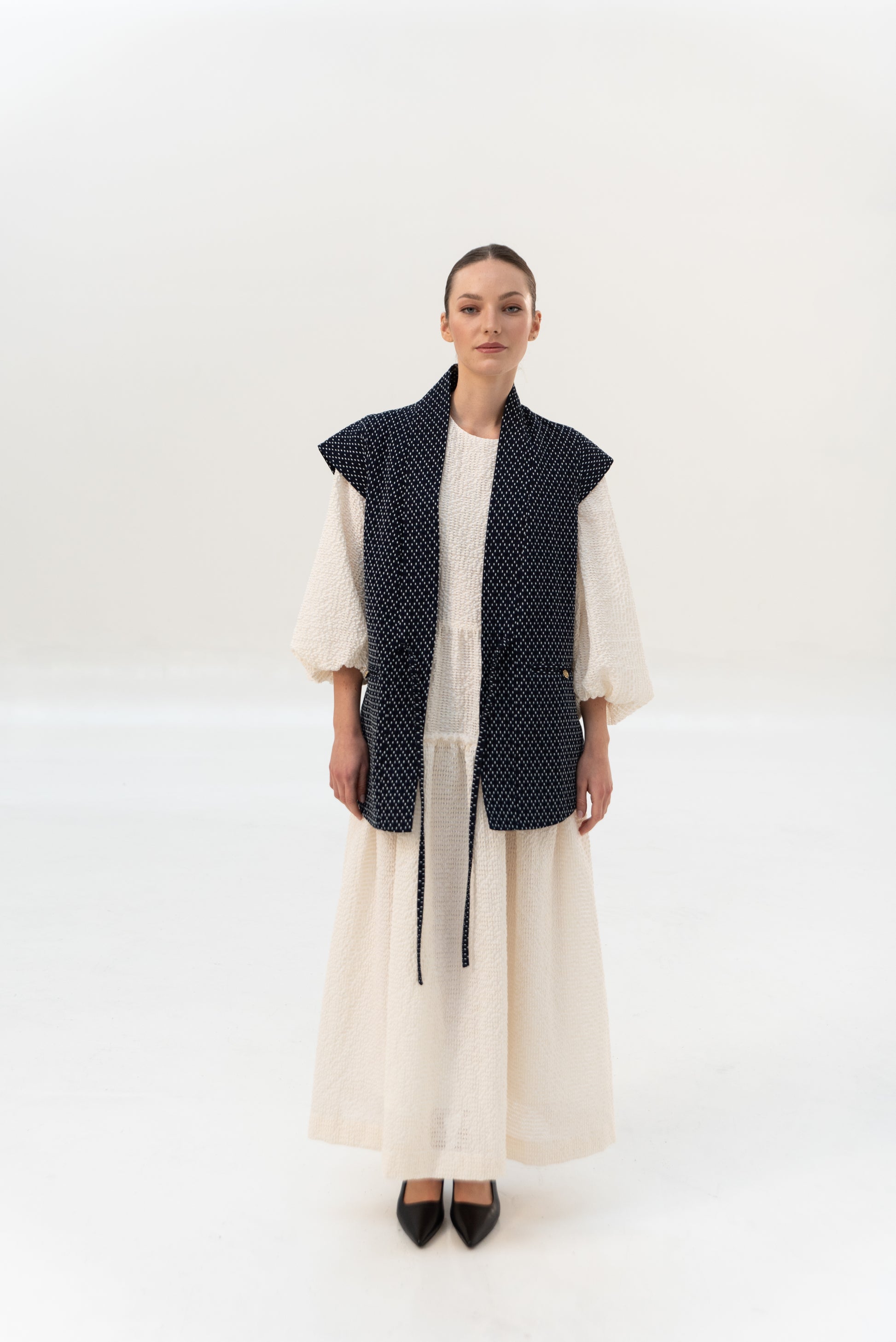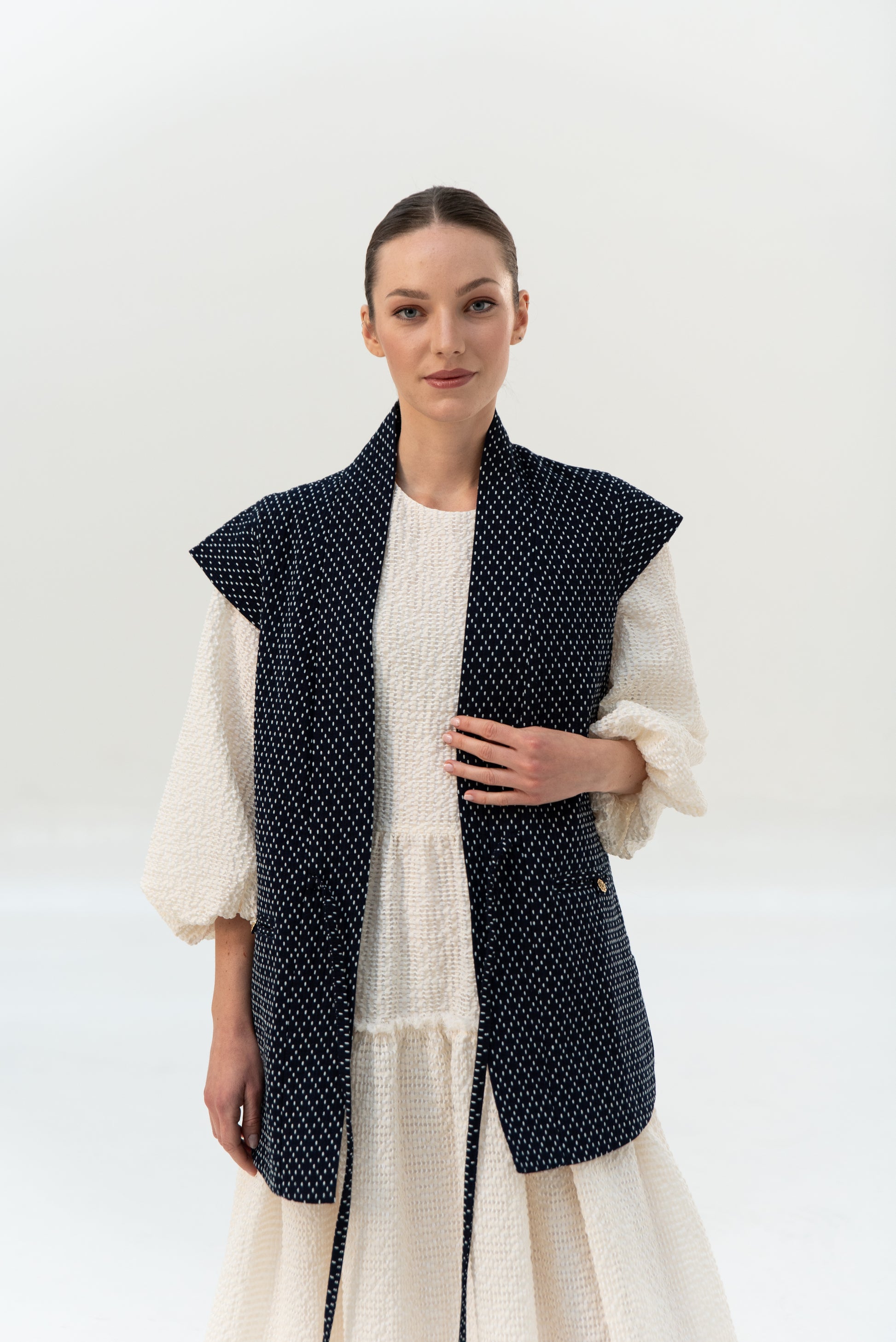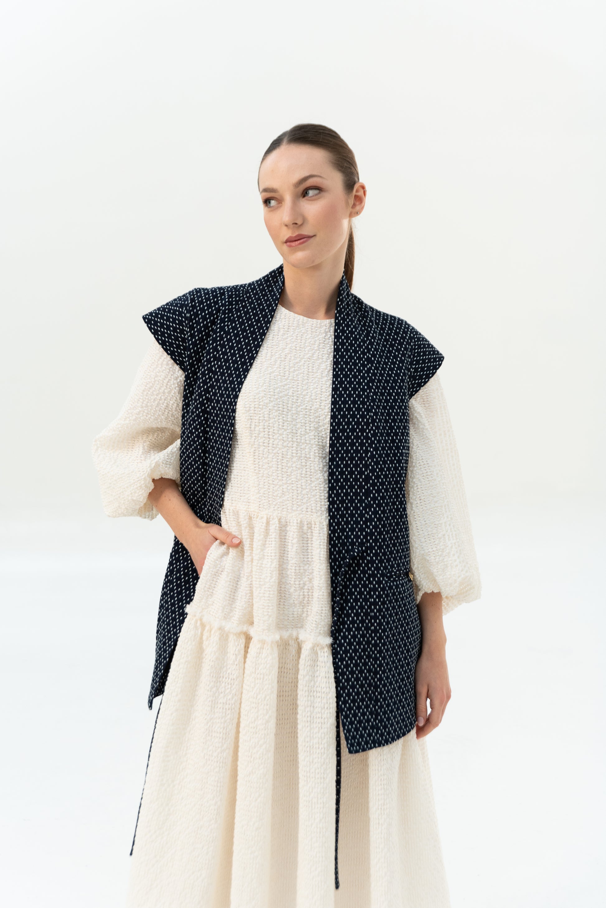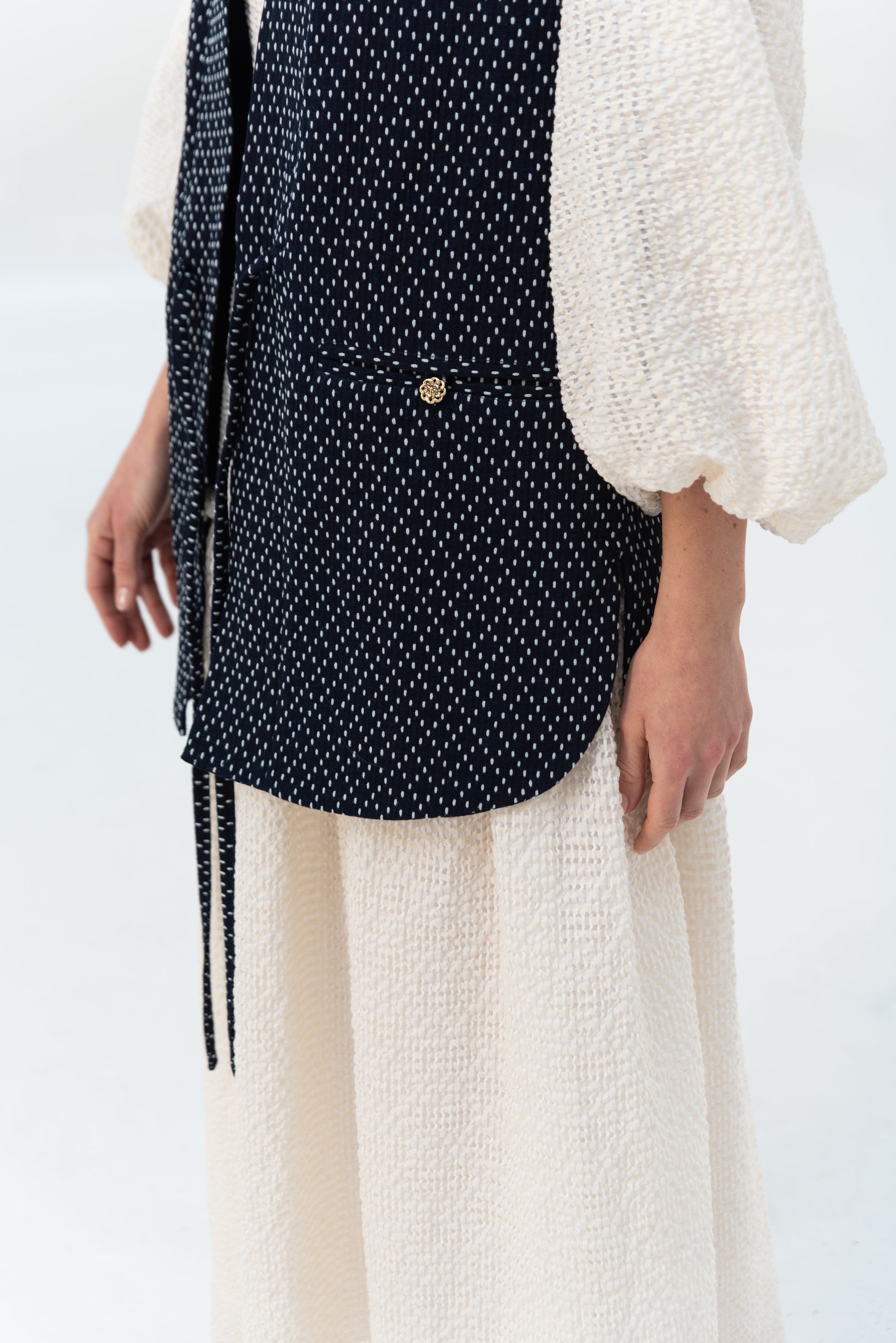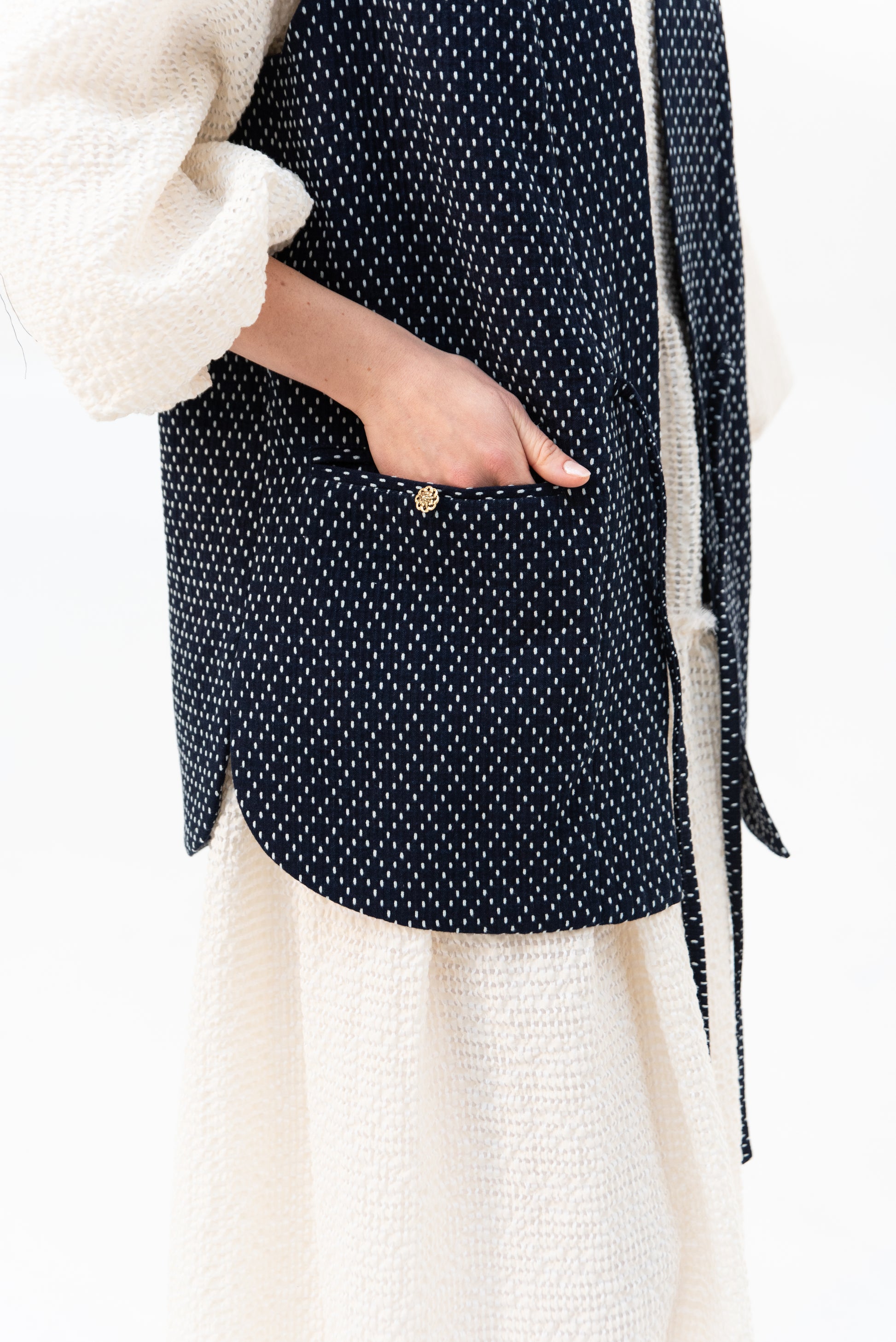 K našemu oblíbenému kimonu YOKO přibyla vestička. Tato je z unikátního japonského deadstocku barveného indigem. Skvěle se hodí na hravější podzimní vrstvení. Vesta se zavazuje na vázačky vepředu a má dvě ozdobně kapsy. Dolní kraj je tvarovaný do oblouku.