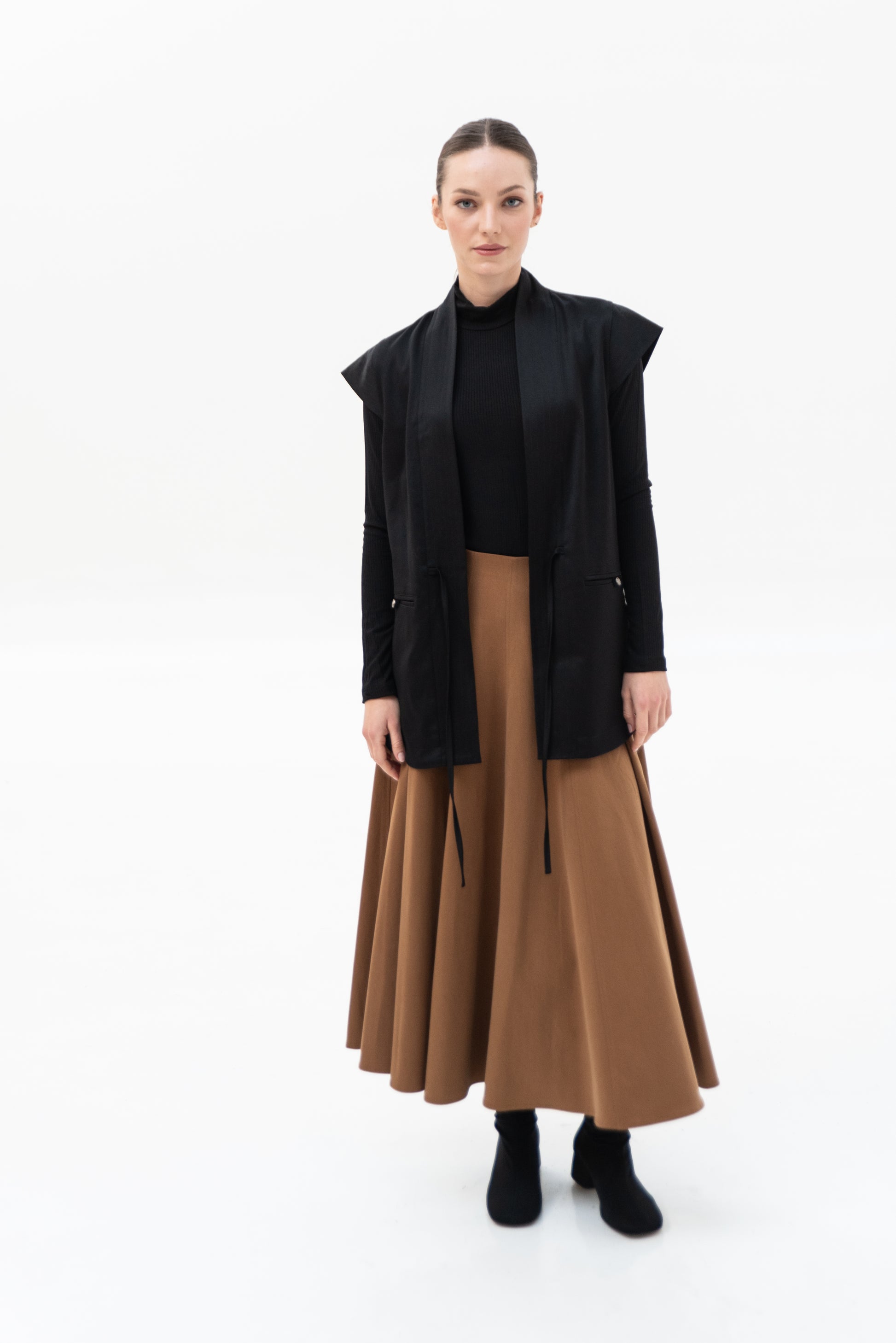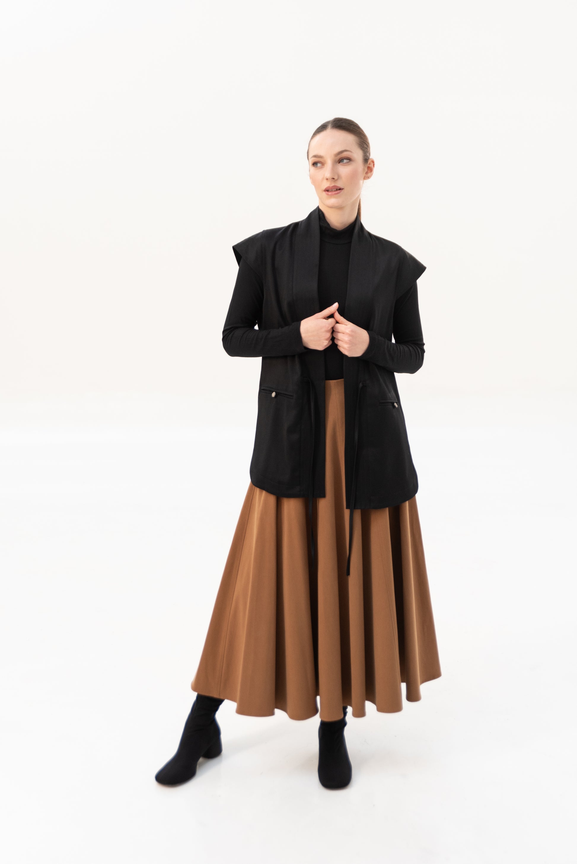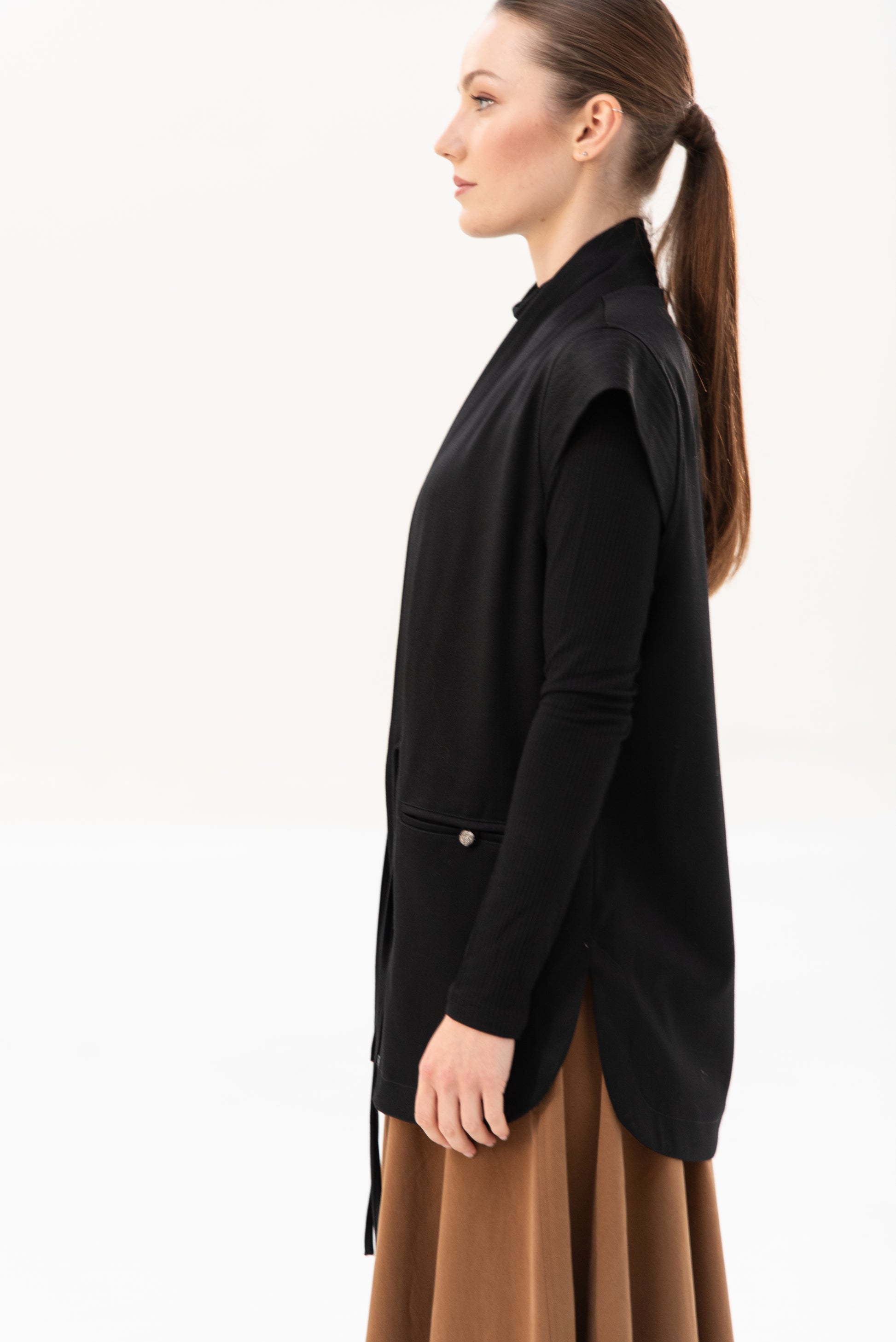 K našemu oblíbenému kimonu YOKO přibyla vestička. Skvěle se hodí na podzimní vrstvení nebo jako elegantní přehoz na společenskou akci. Vesta se zavazuje na vázačky vepředu a má dvě ozdobně kapsy. Dolní kraj je tvarovaný do oblouku.