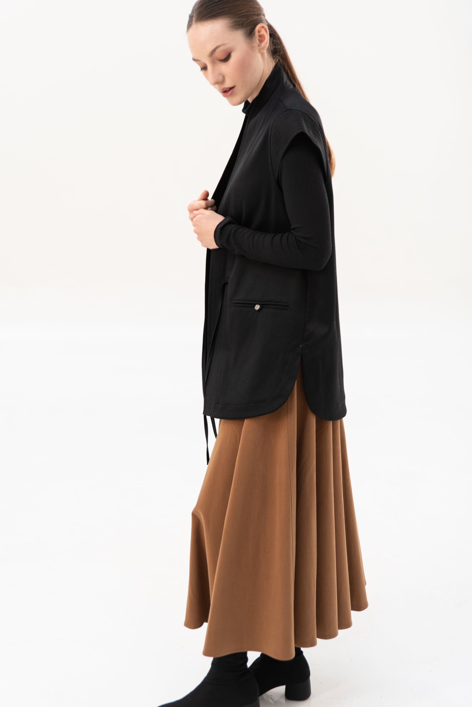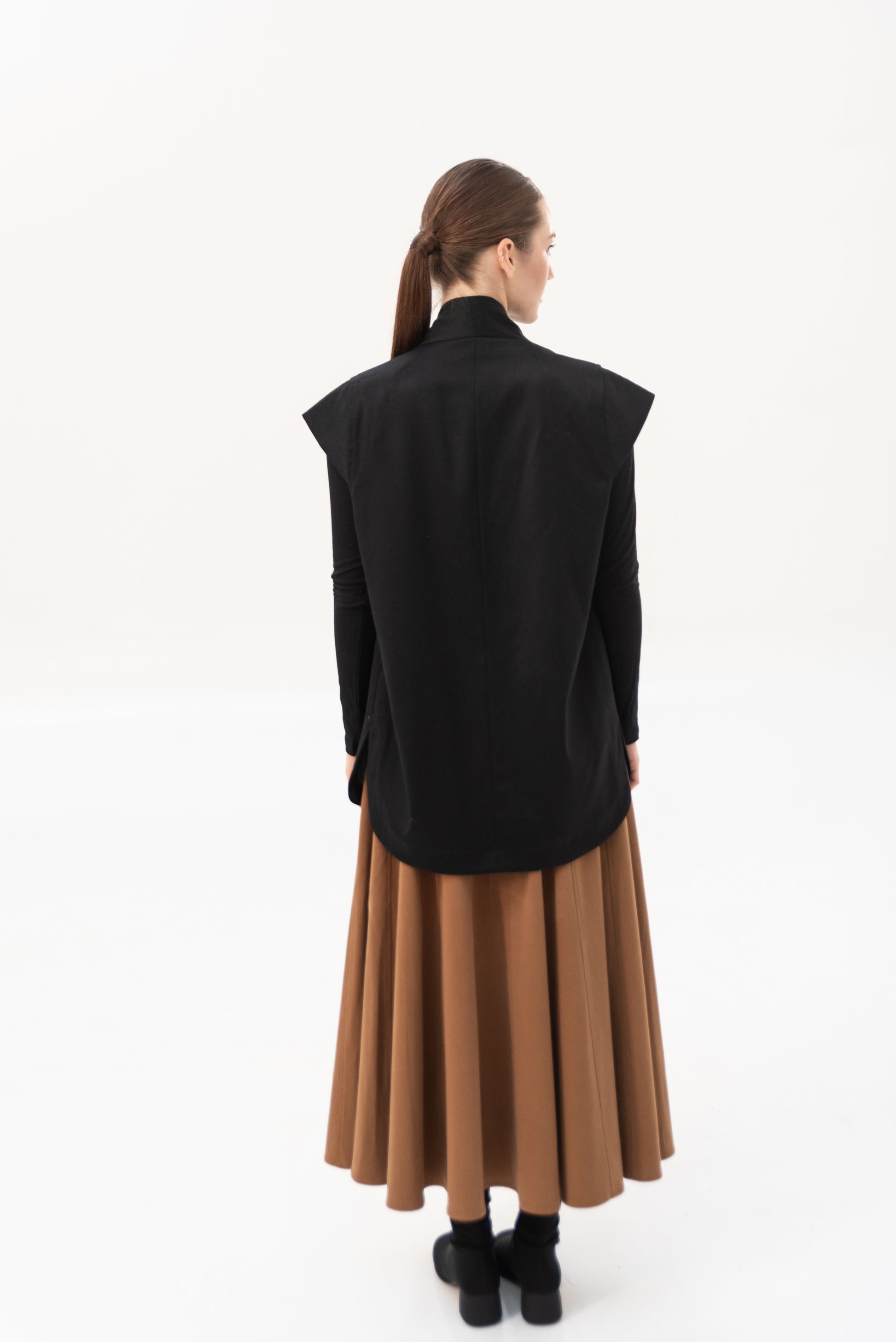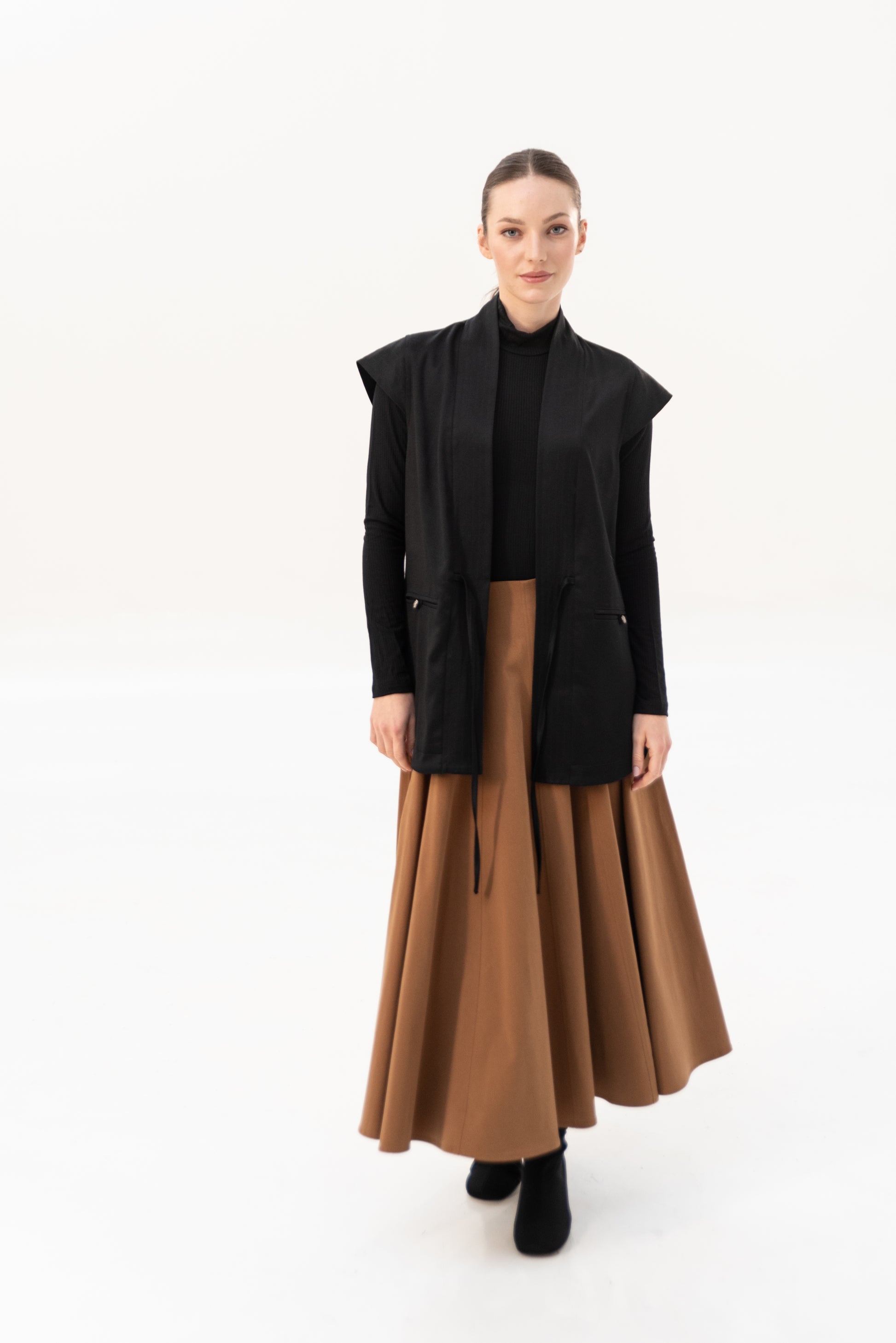 K našemu oblíbenému kimonu YOKO přibyla vestička. Skvěle se hodí na podzimní vrstvení nebo jako elegantní přehoz na společenskou akci. Vesta se zavazuje na vázačky vepředu a má dvě ozdobně kapsy. Dolní kraj je tvarovaný do oblouku.